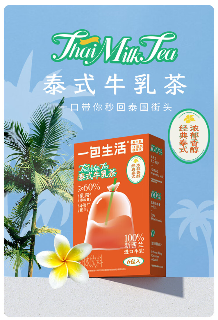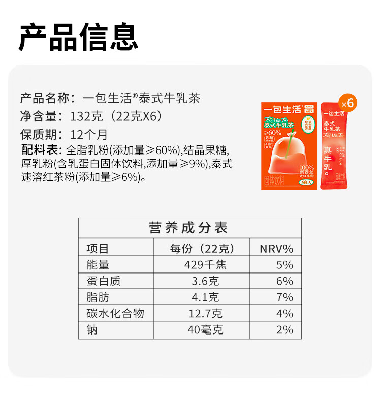 一包生活 进口乳粉0蔗糖秋冬冲泡热饮 泰式牛乳茶 132g(22g*6入) 红色(单位:盒)