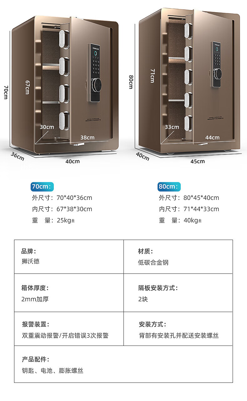 狮沃德 远程密钥电子密码指纹保险柜 70CM单位:个 黑色
