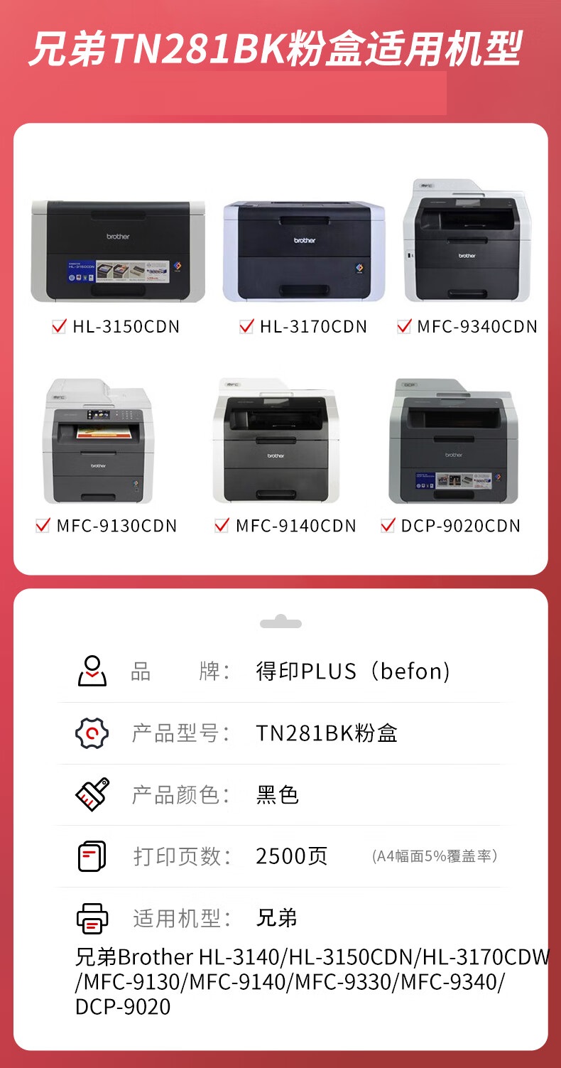 得印PLUS TN281BK黑色粉盒 兄弟TN285/HL3140/3150CDN/单位:支 黑色