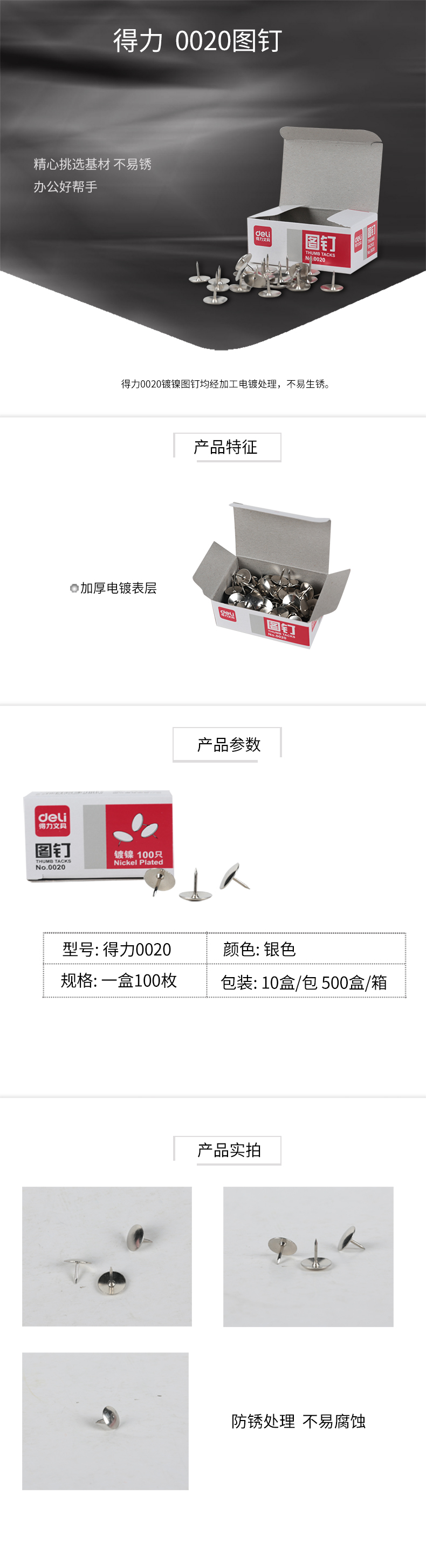 得力0020图钉(100粒/盒) 20盒 银色