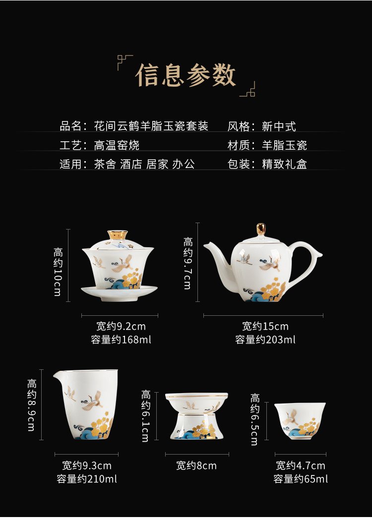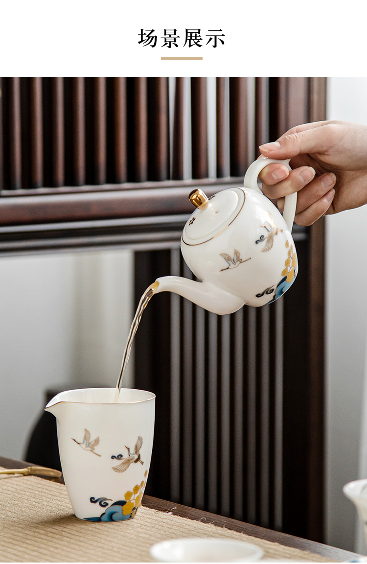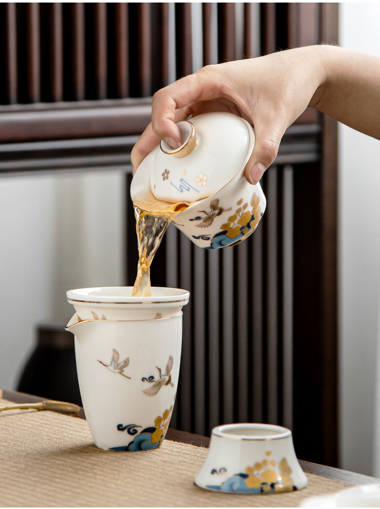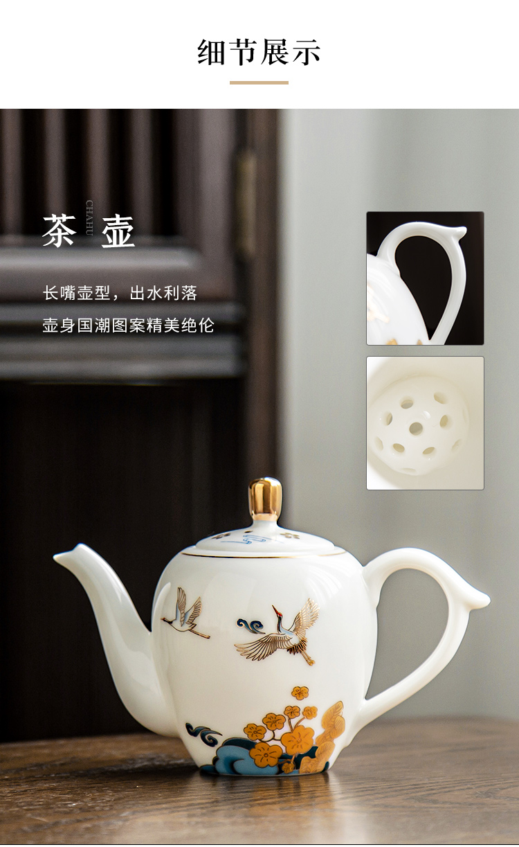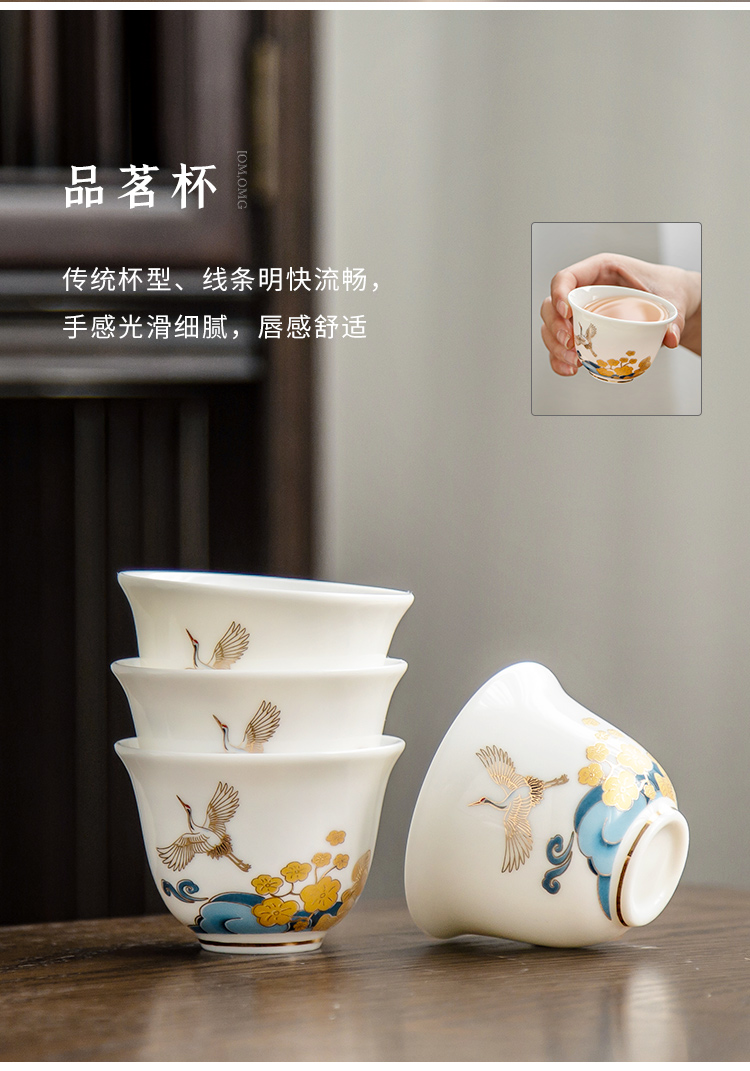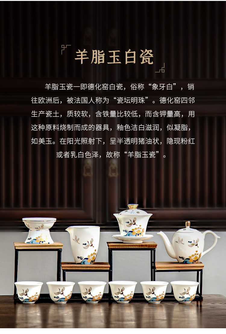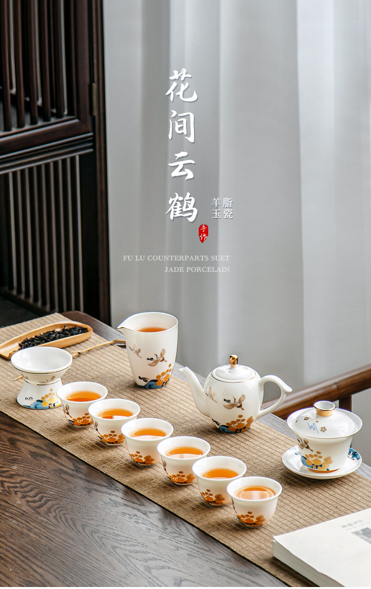金镶玉 花间云鹤羊脂玉瓷 功夫茶具套装 10件套(单位 : 套) 白色