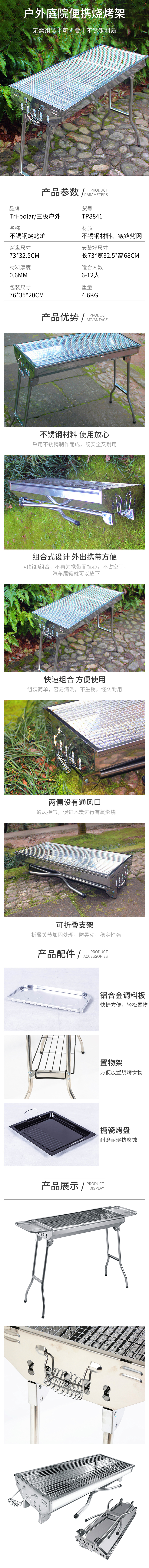 三极 Tri-polar TP8841 加厚大号不锈钢烧烤架户外折叠烧烤架全套(单位:个) 73*70*33.5cm银色