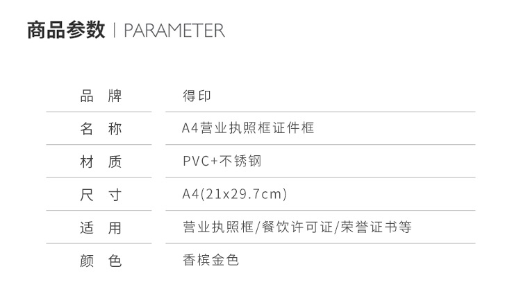 得印(befon) A4营业执照相框 证书框 2654 计价单位:个 香槟金色