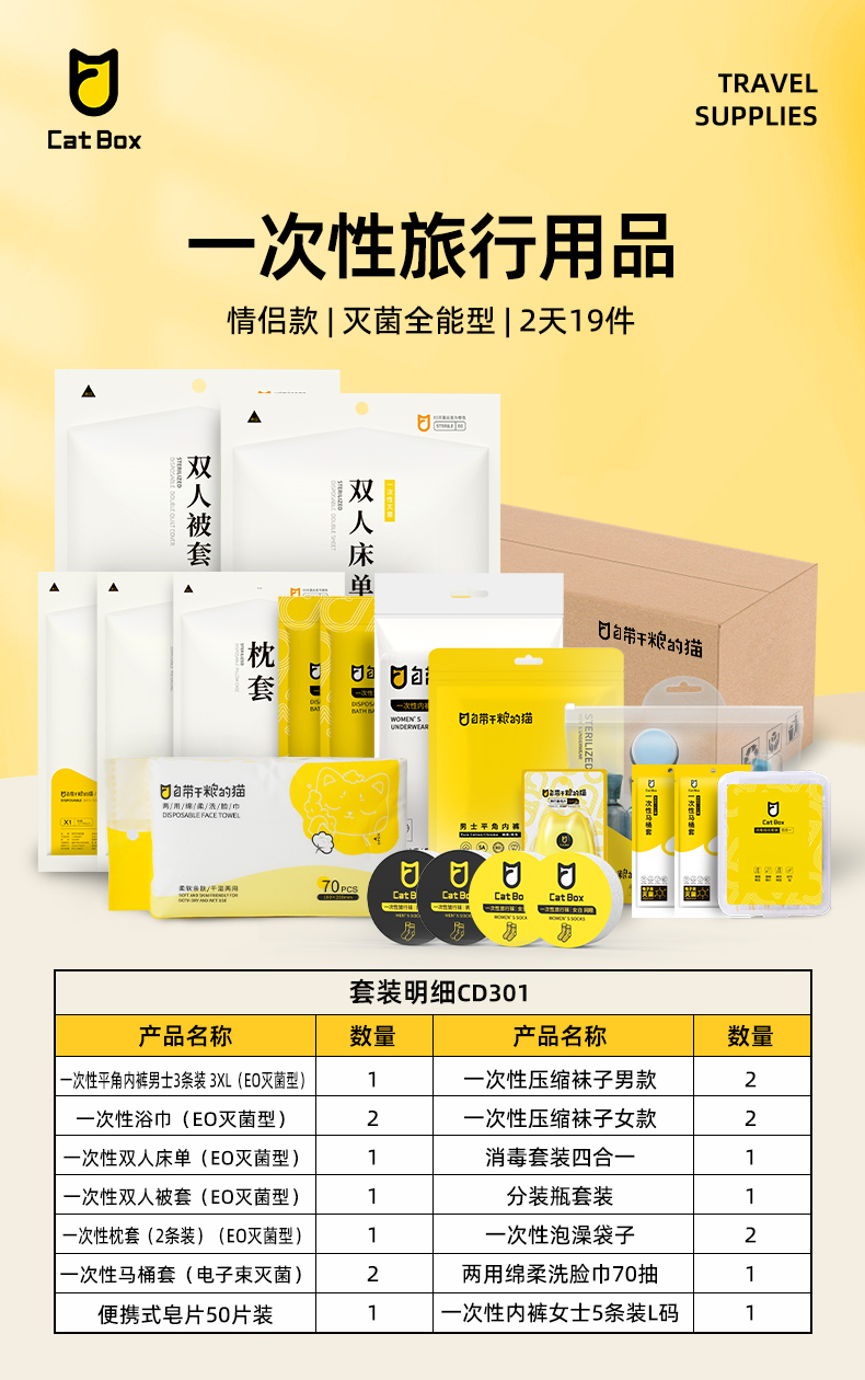 自带干粮的猫 一次性旅行用品 CD301 情侣款2天19件(灭菌全能型) 白色(单位:套)