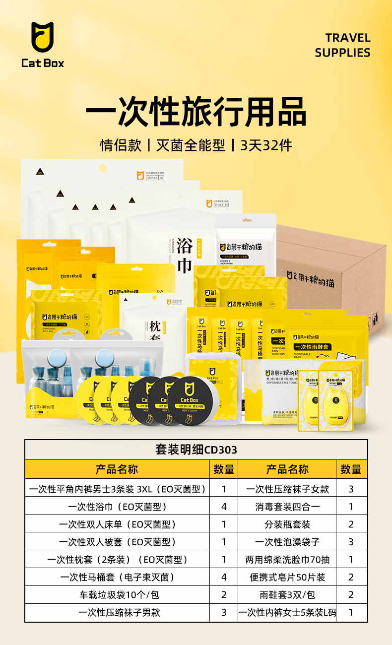 自带干粮的猫 一次性旅行用品 CD303 情侣款3天32件(灭菌全能型) 白色(单位:套)