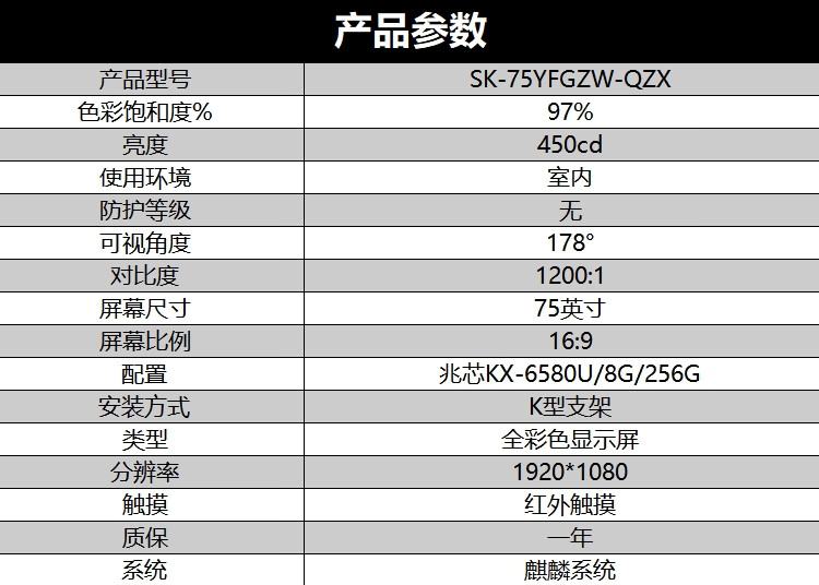 友凡 SK-75YFGZW-QZX 兆芯KX-6580U 8G/256G K型支架 75英寸 广告机 黑色(单位:台)