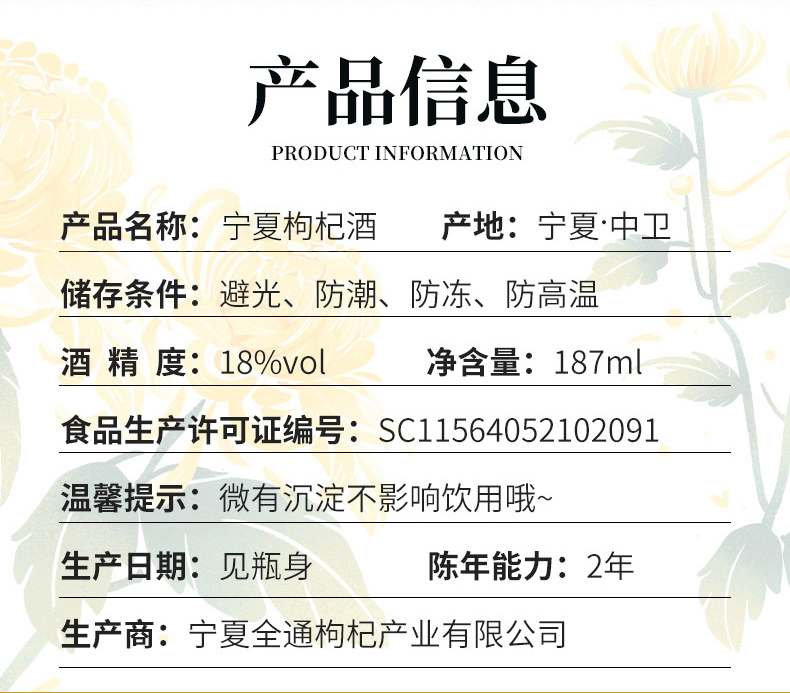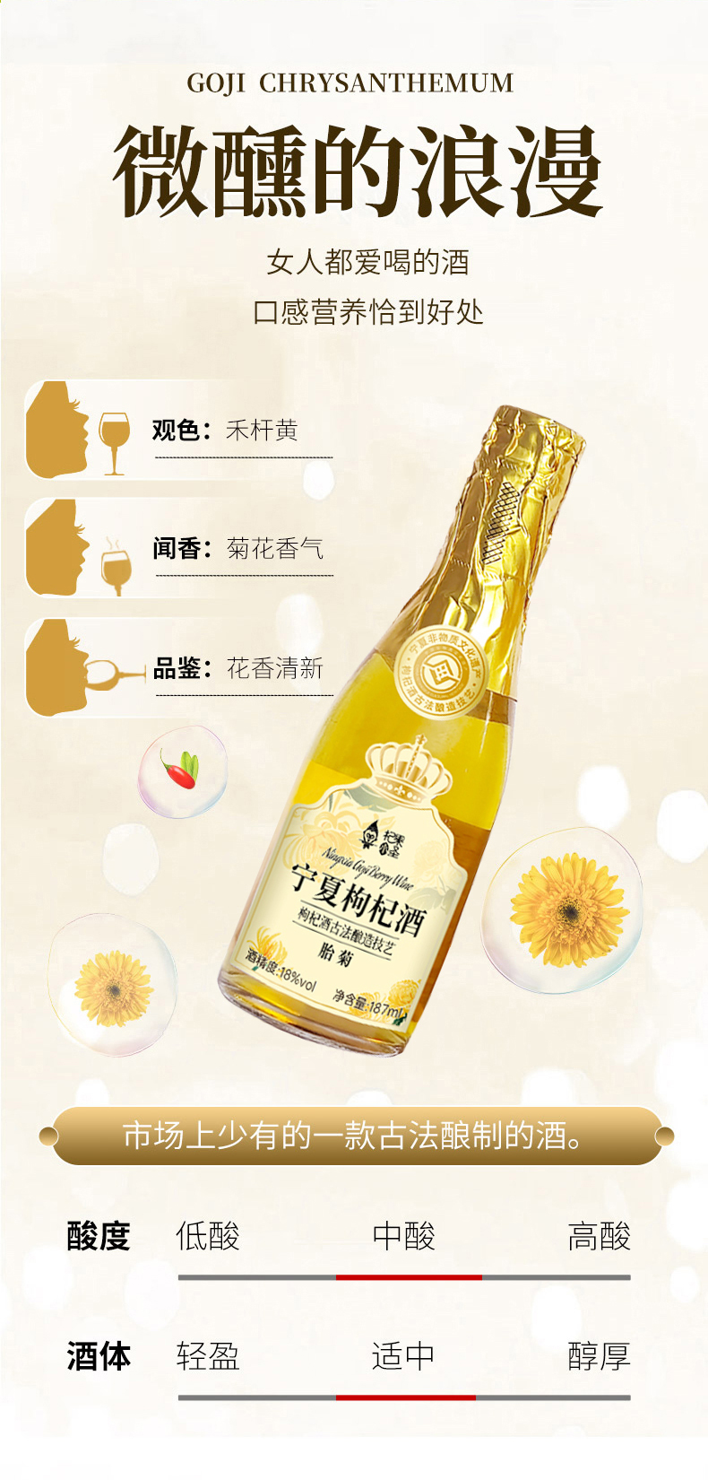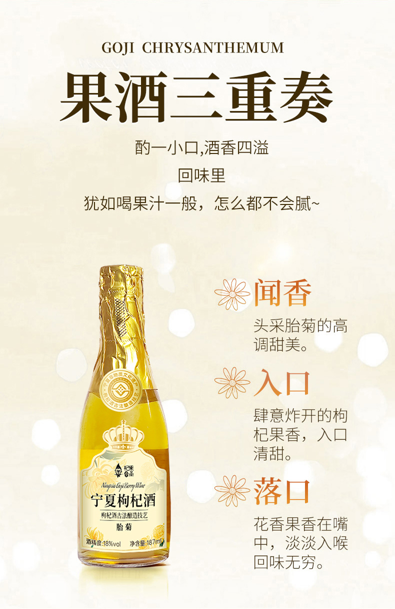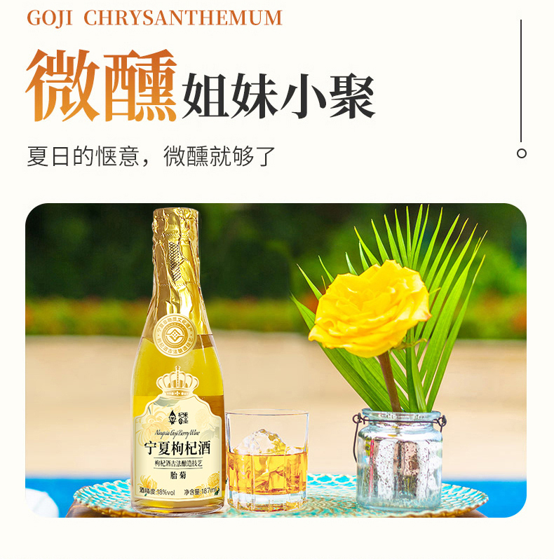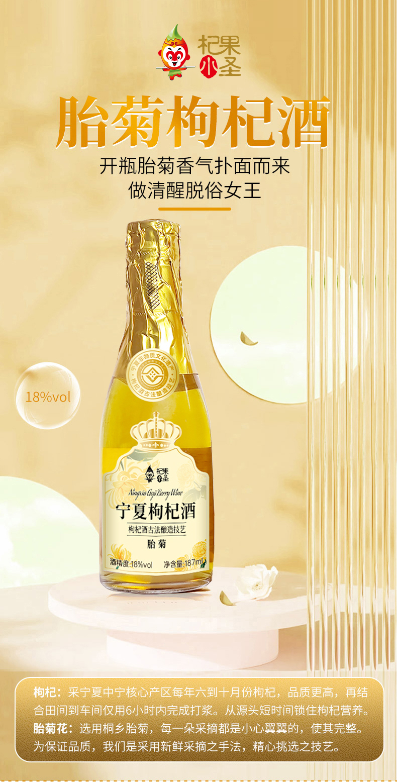 杞果小圣 胎菊枸杞酒宁夏非遗古法酿造技艺 18度微醺 187ml*6瓶 胎菊黄(单位:盒)