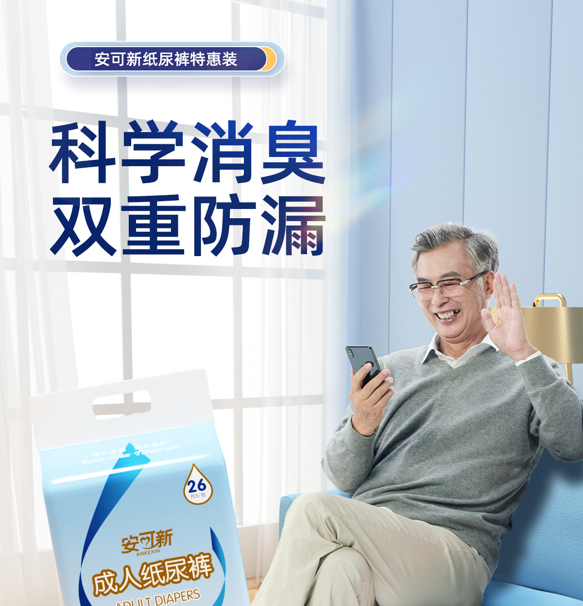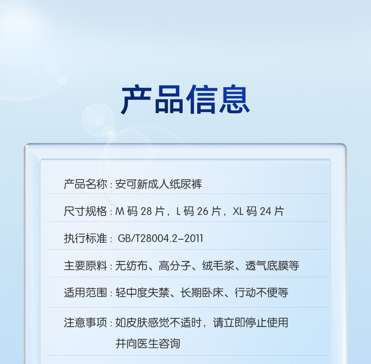 安可新 日用透气搭扣式成人纸尿裤男女通用大码老人尿不湿 AKX-2172-2 26片*L码 蓝色(单位:包)