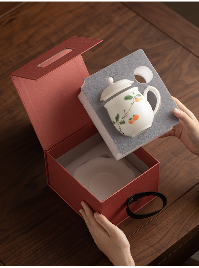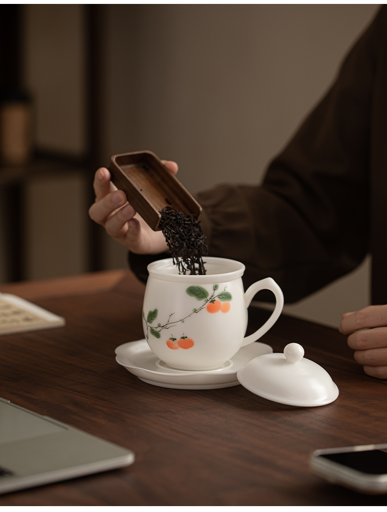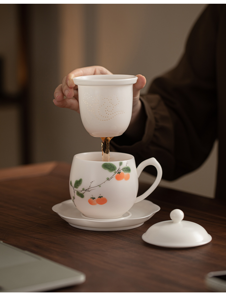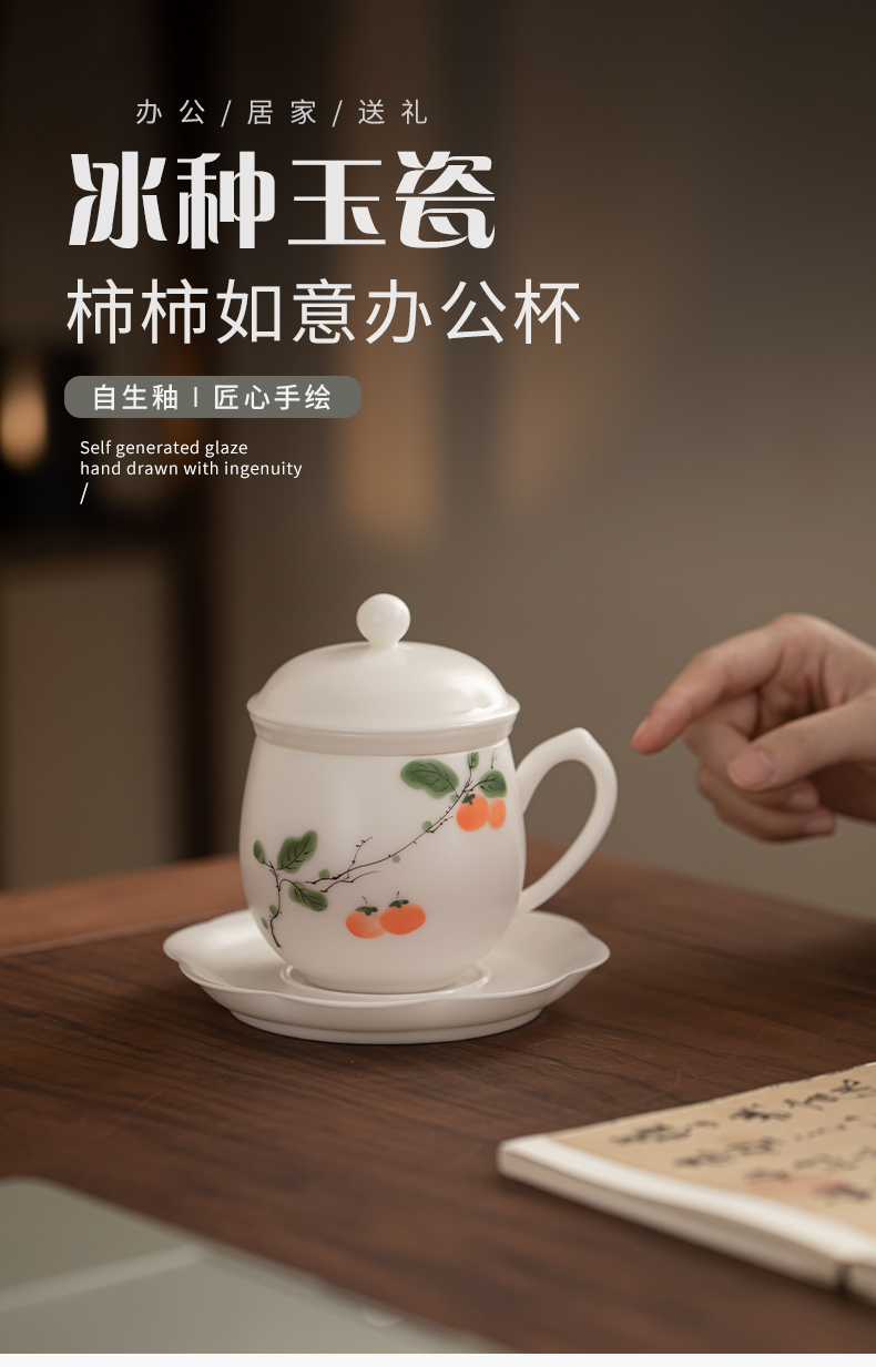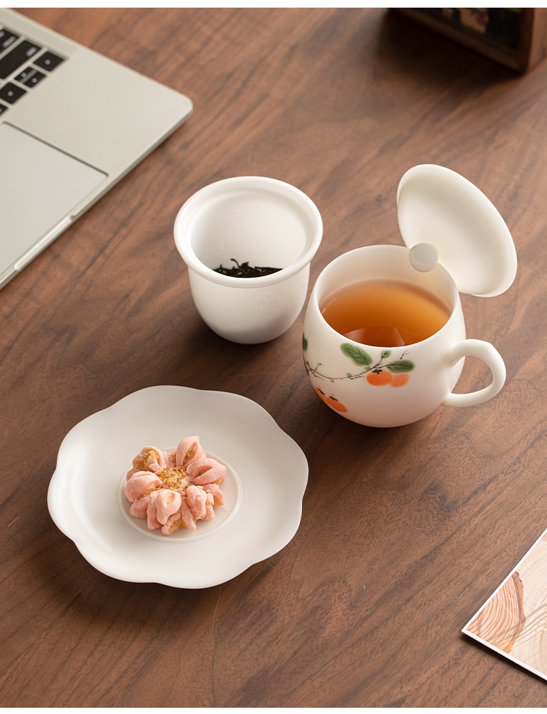 苏氏陶瓷(SUSHI CERAMICS) 素烧手绘柿柿如意办公杯 J1264 茶杯300ml 白色(单位:套)