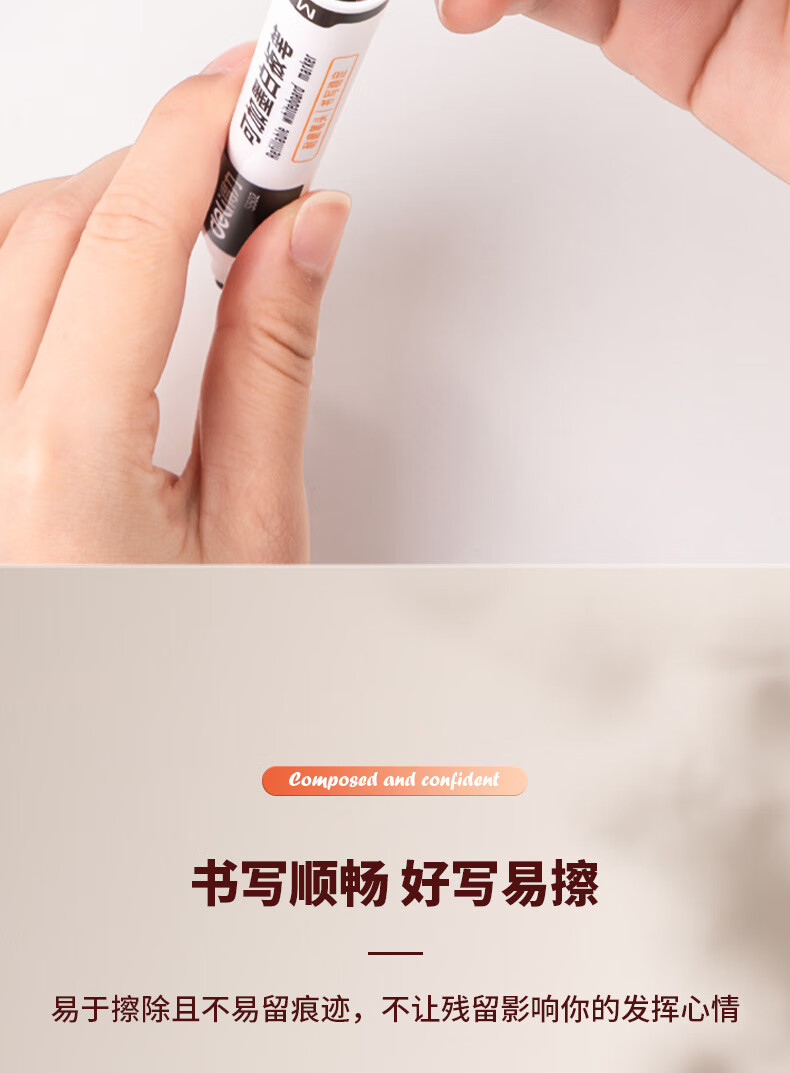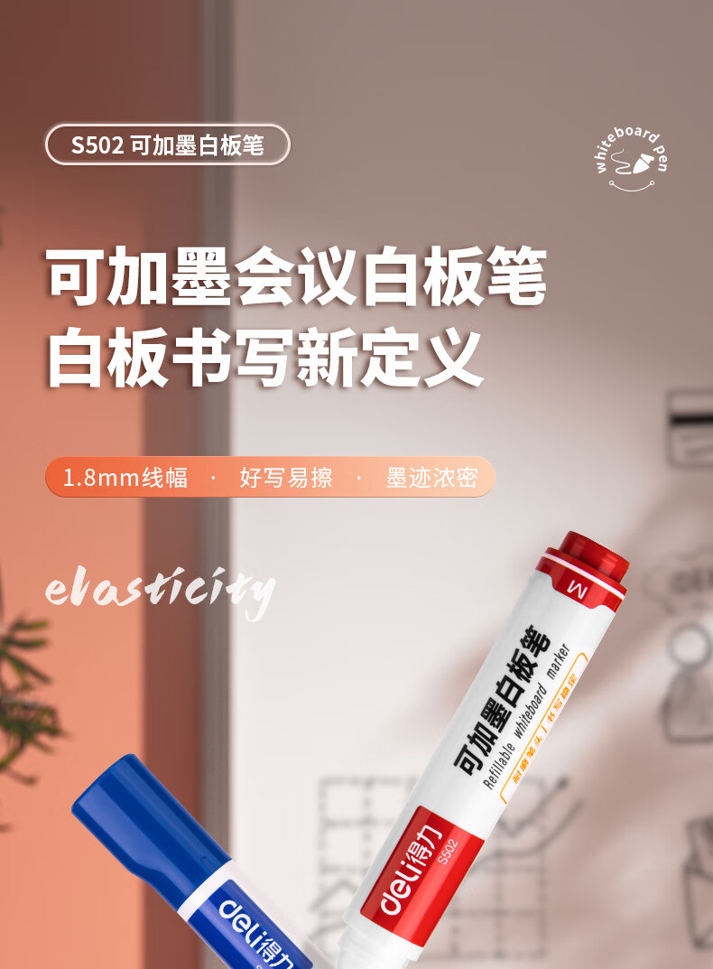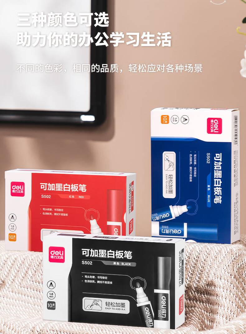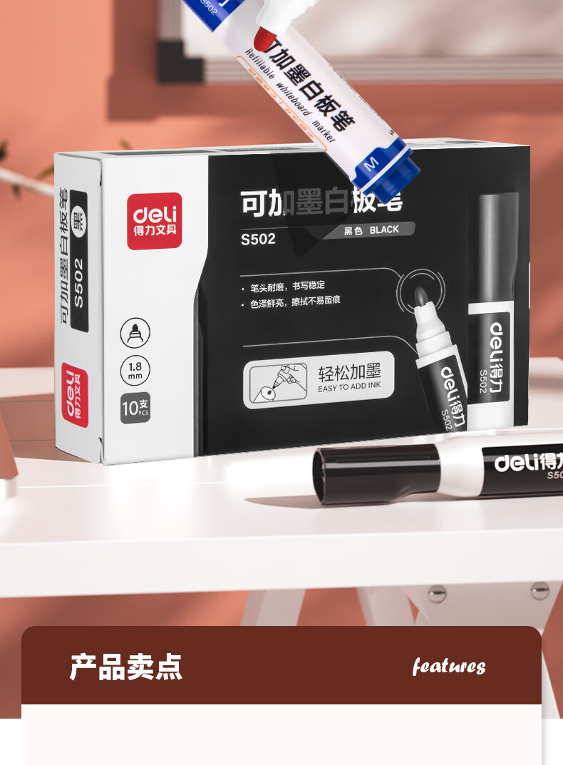 得力S502可加墨白板笔(黑) 10支/盒 黑色
