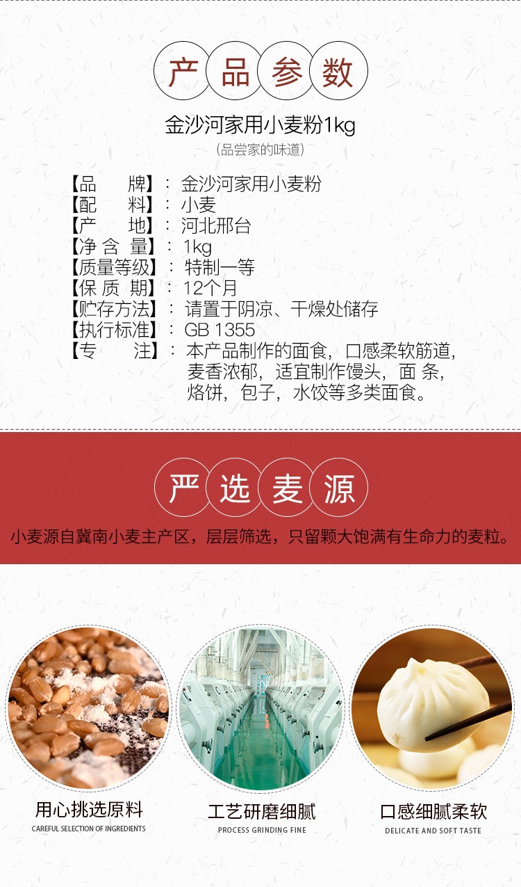 金沙河面粉 家用小麦粉 1kg*2袋/4斤 优质多用途麦芯粉 红色