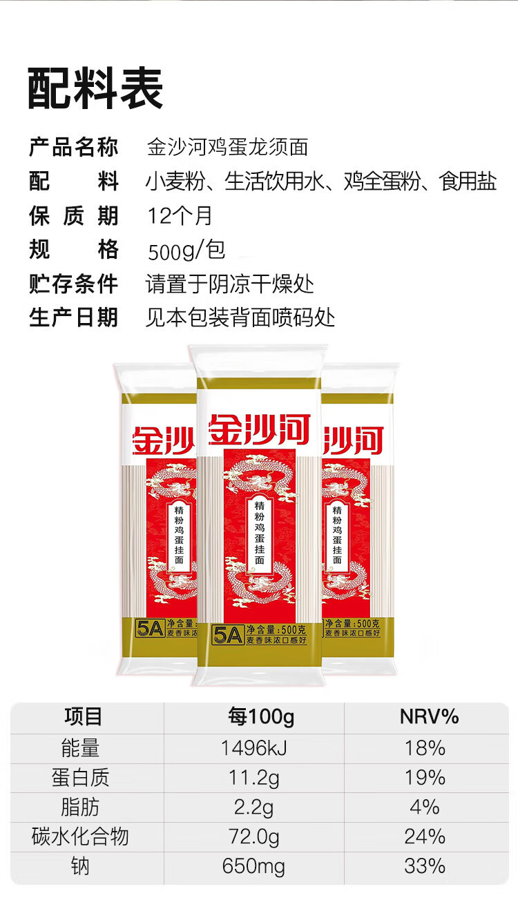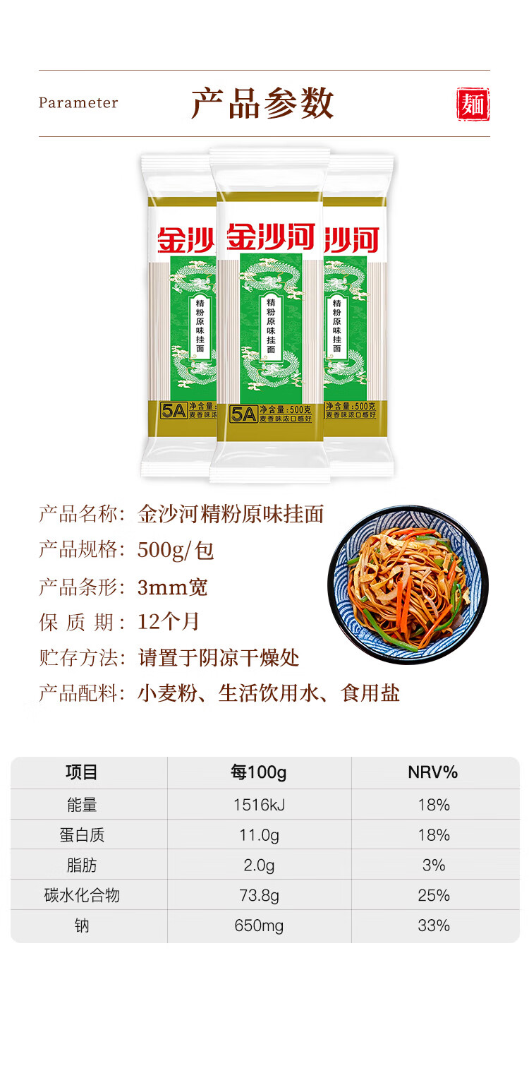金沙河面条 精粉原味+鸡蛋+龙须挂面 500g*3包/3斤 三种条形 绿色