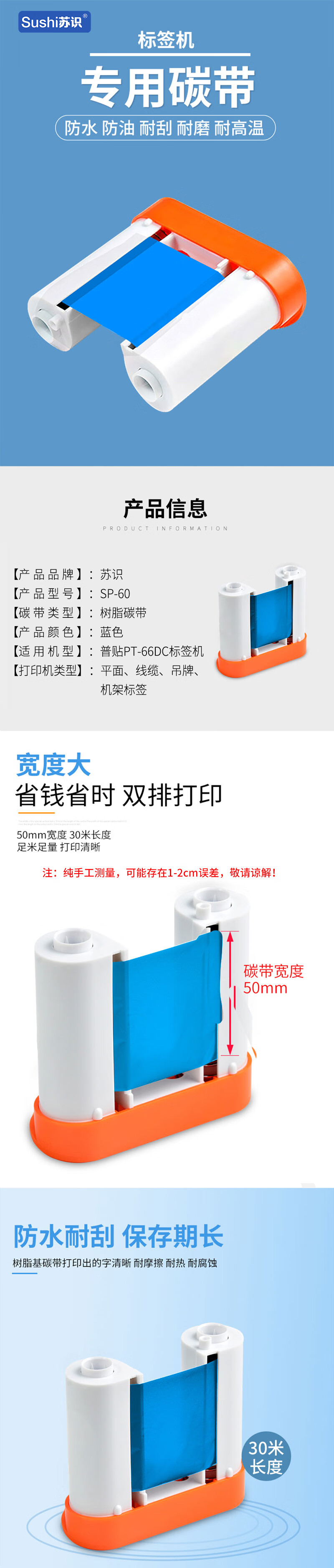 苏识 SP-60色带-蓝色 标签机碳带 手持条码标签打印机色带 1.00 个/卷 (计价单位:卷) 蓝色 蓝色