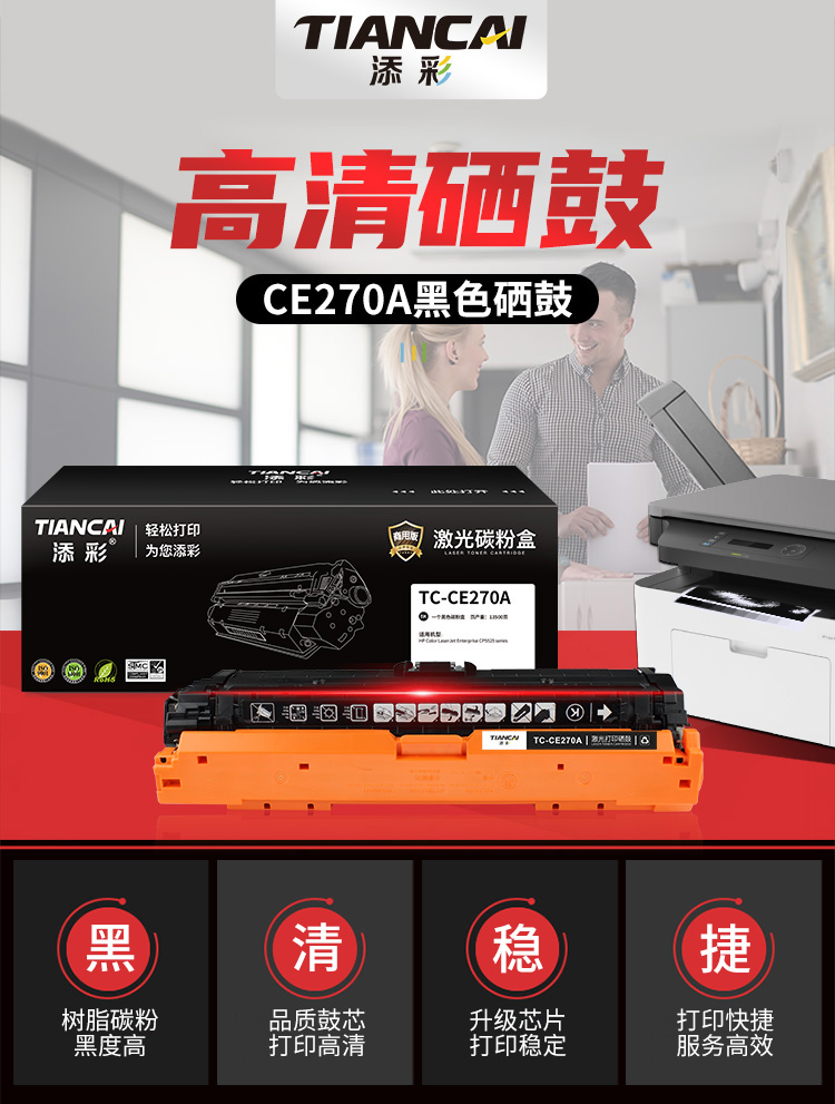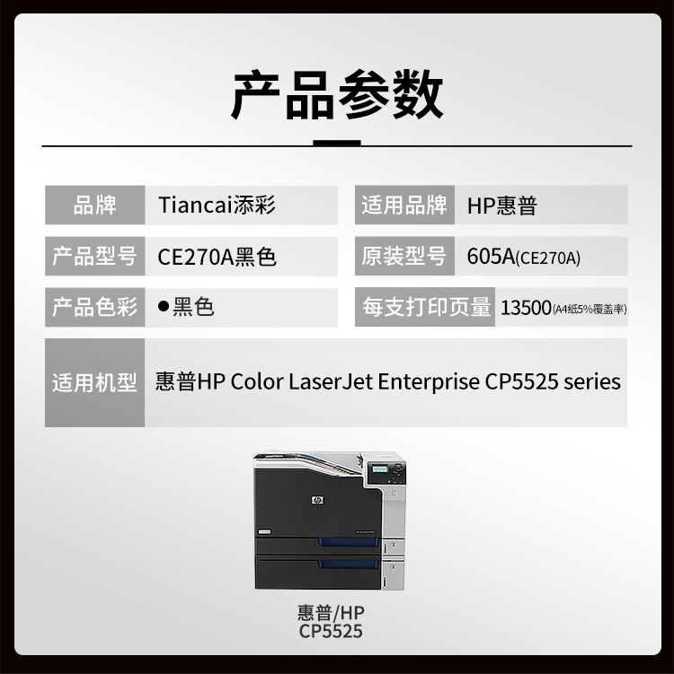 添彩 TC-CE270A 商用版 适用于HP Color LaserJet Enterprise CP5525 series 打印量13500页 硒鼓 1.00 只/个 (计价单位:个) 黑色 黑色