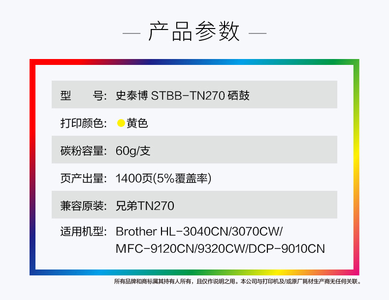 史泰博 STBB-TN270 打印量约1400页 适用Brother HL-3040CN 3070CW MFC-9120CN 9320CW等 硒鼓 1.00 只/盒 (计价单位:盒) 黄色 黄色