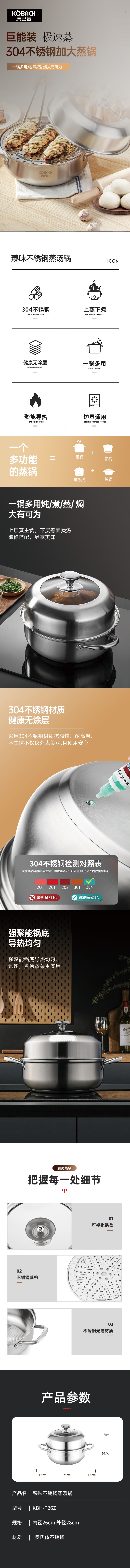 康巴赫 臻味不锈钢蒸汤锅 KBH-T26Z 内径26cm 外径28cm 不锈钢色(单位:个)