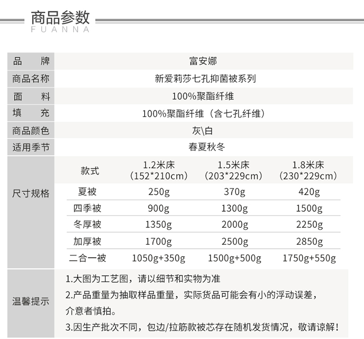 富安娜 新爱莉莎七孔抑菌四季被 203*229cm(床) 珍珠灰