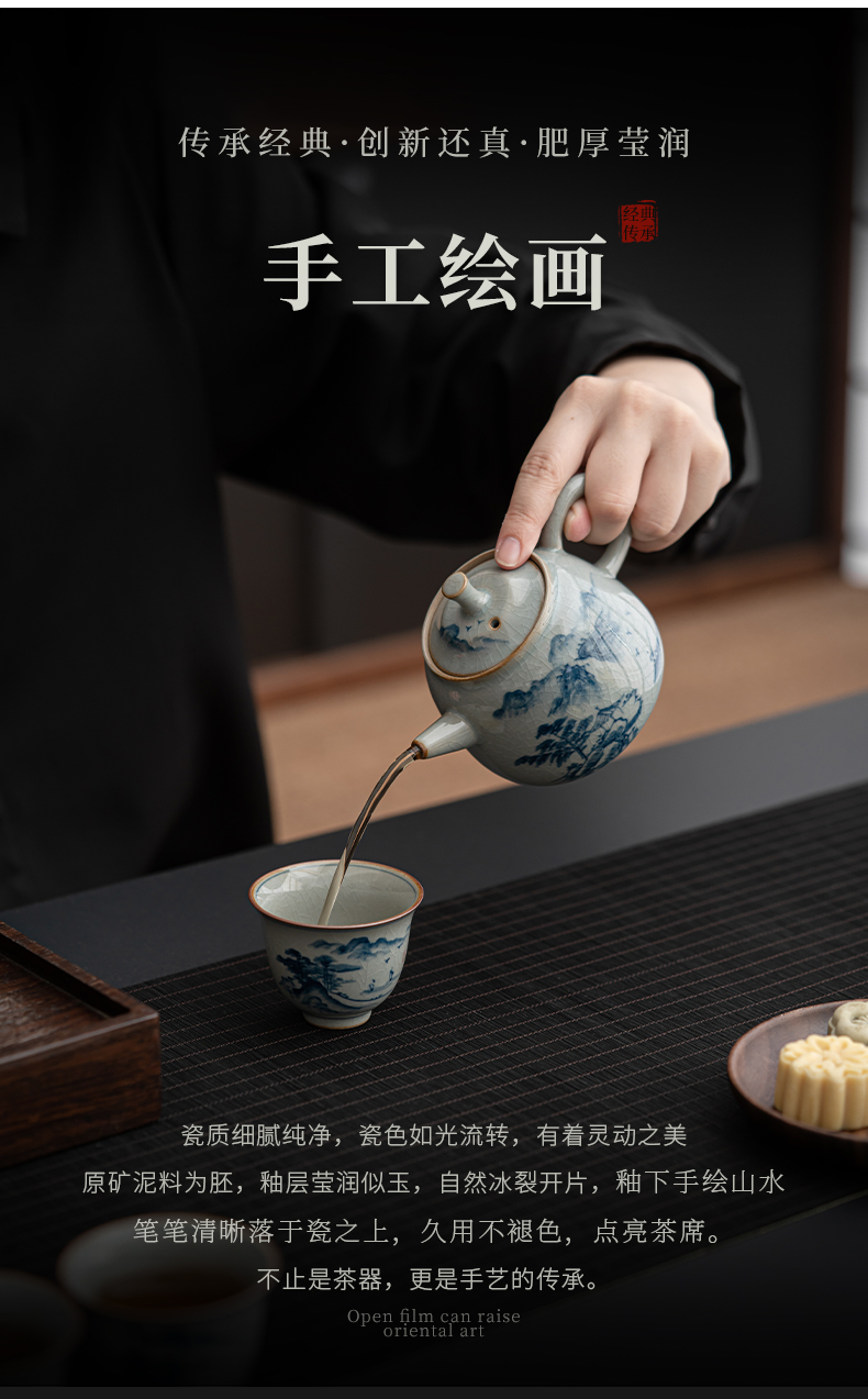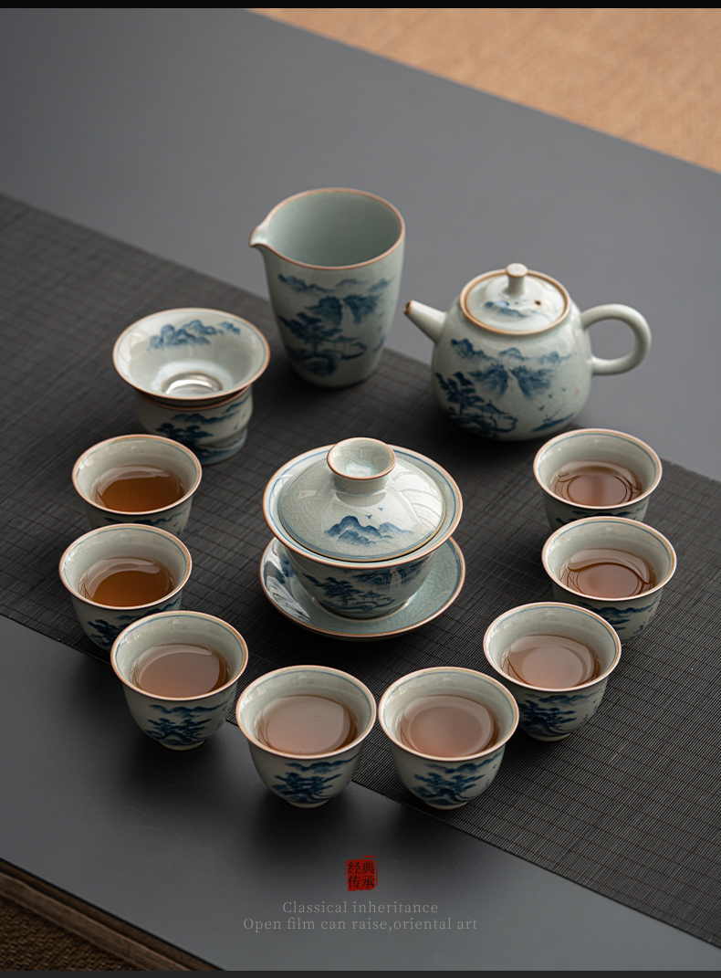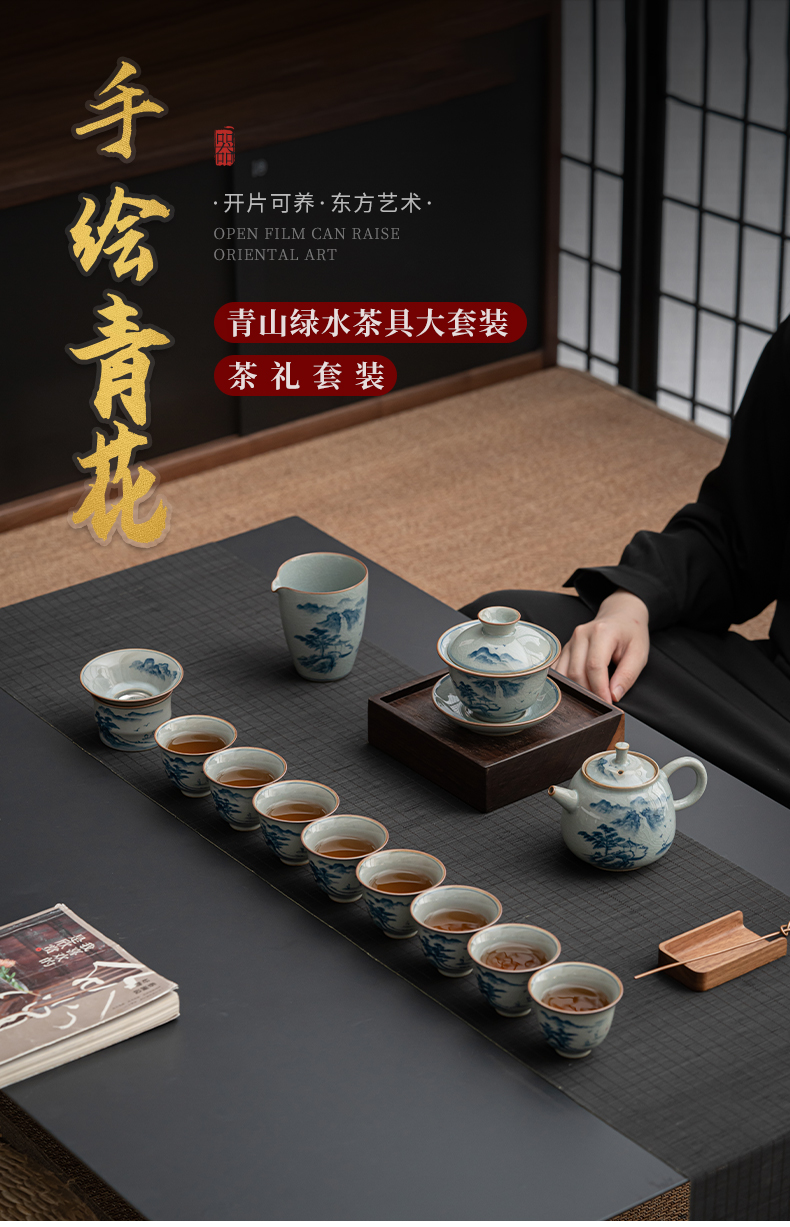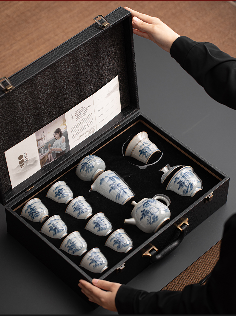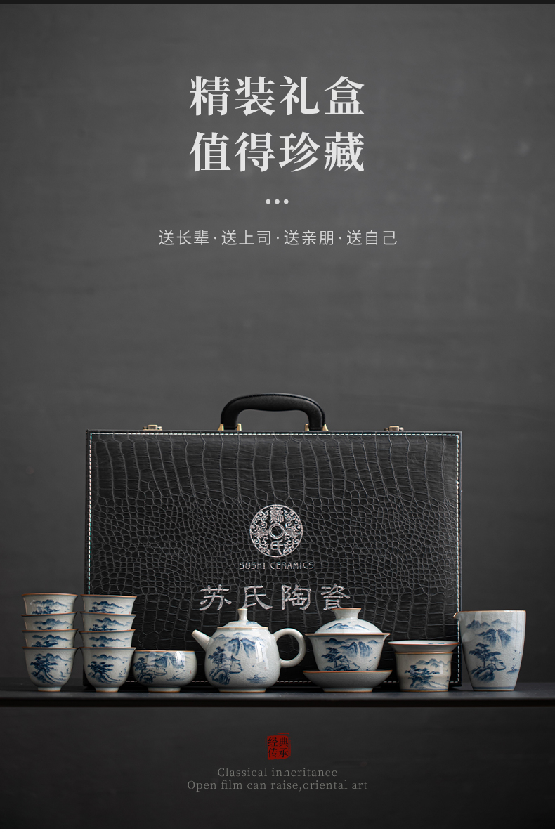苏氏陶瓷(SUSHI CERAMICS)J0932整套茶具汝窑手绘山水泛舟大套组礼盒装(单位:套) 灰色