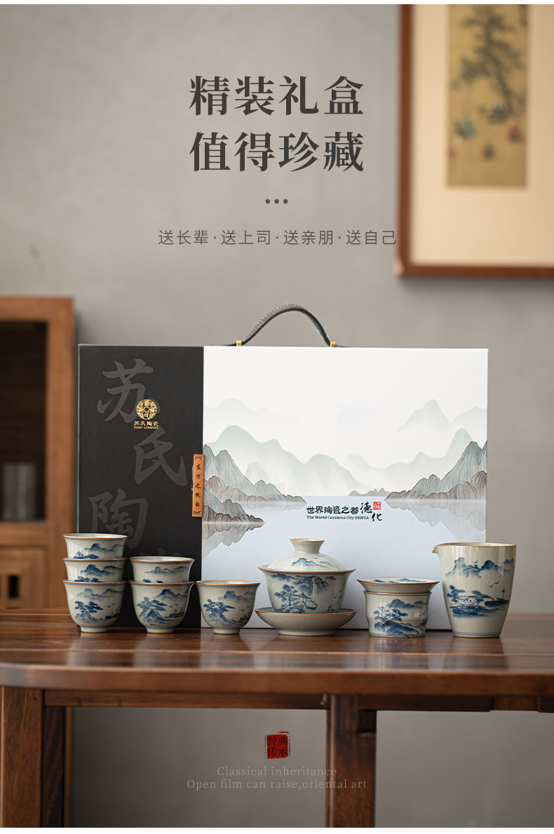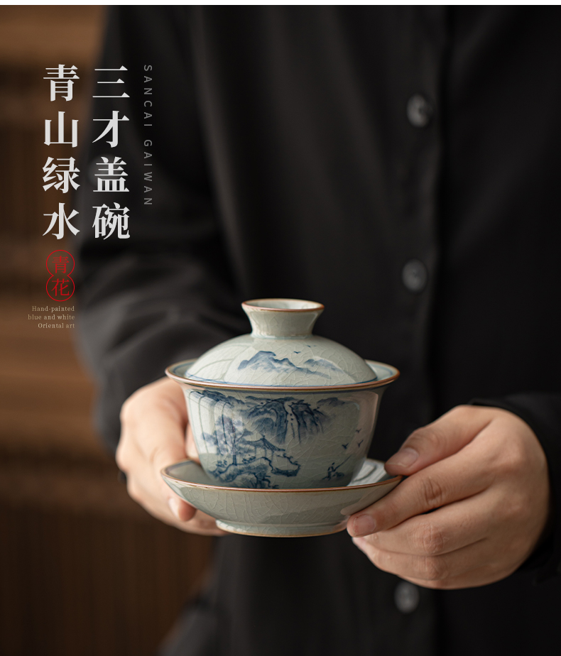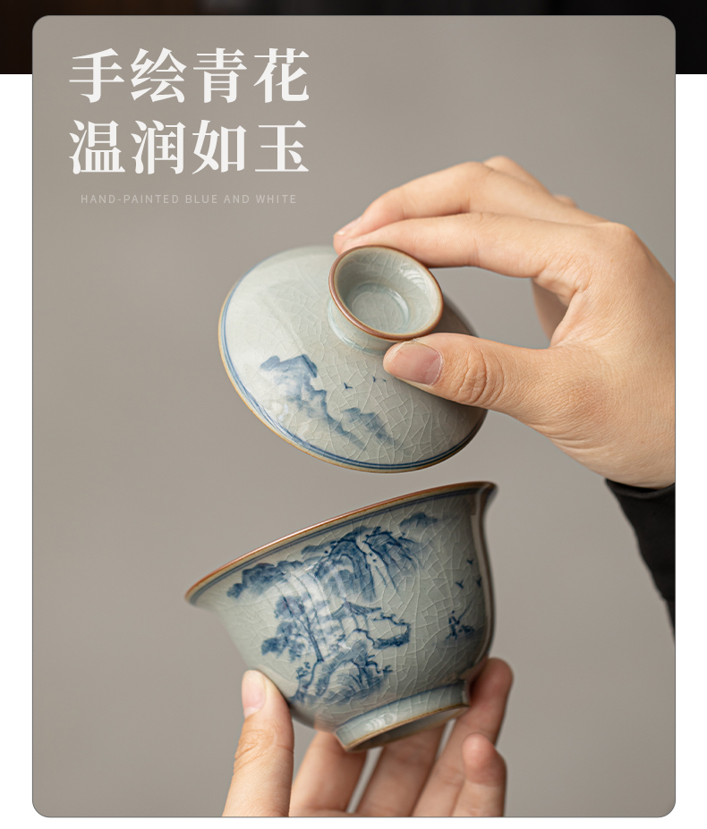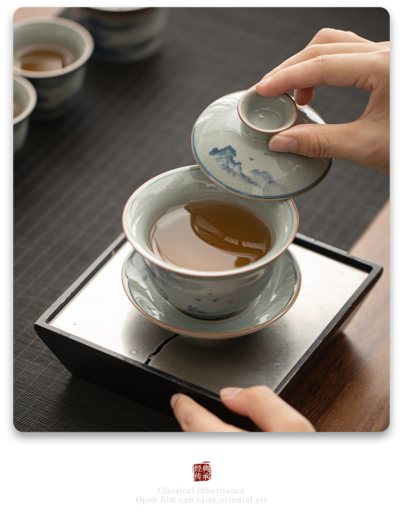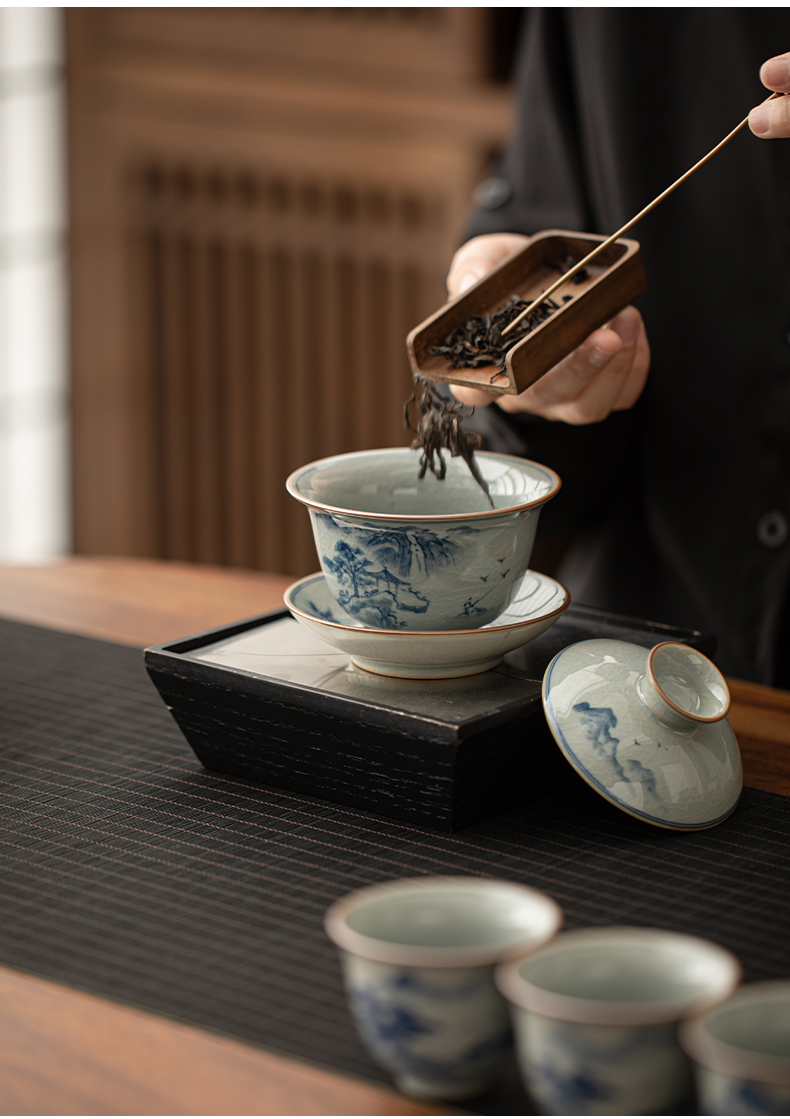 苏氏陶瓷(SUSHI CERAMICS)J1028汝窑手绘山水泛舟盖碗茶具套装苏爱珍作品(单位:套) 灰色