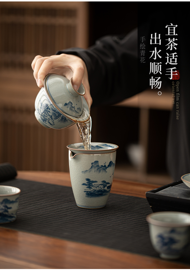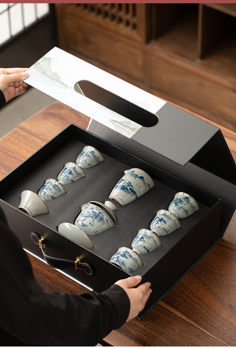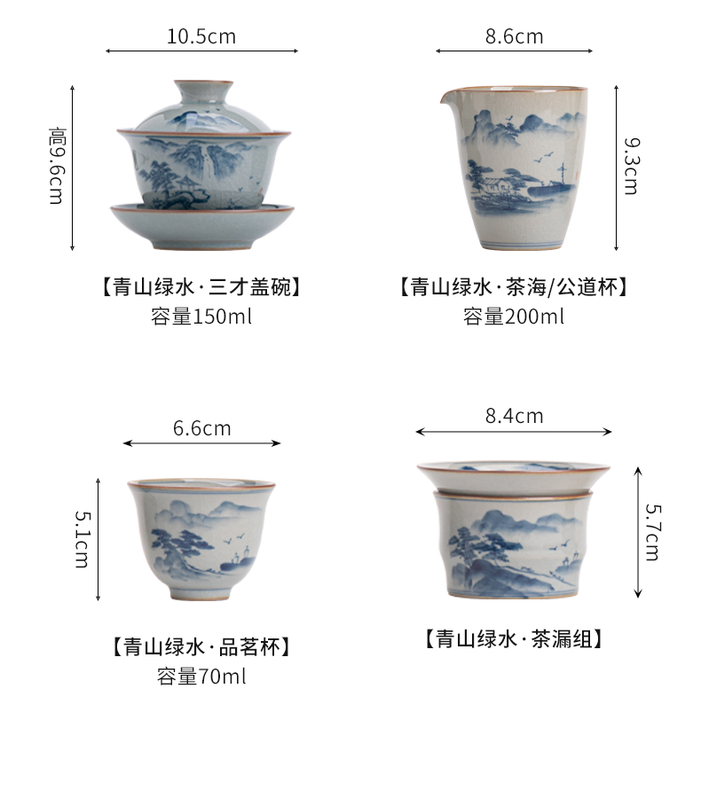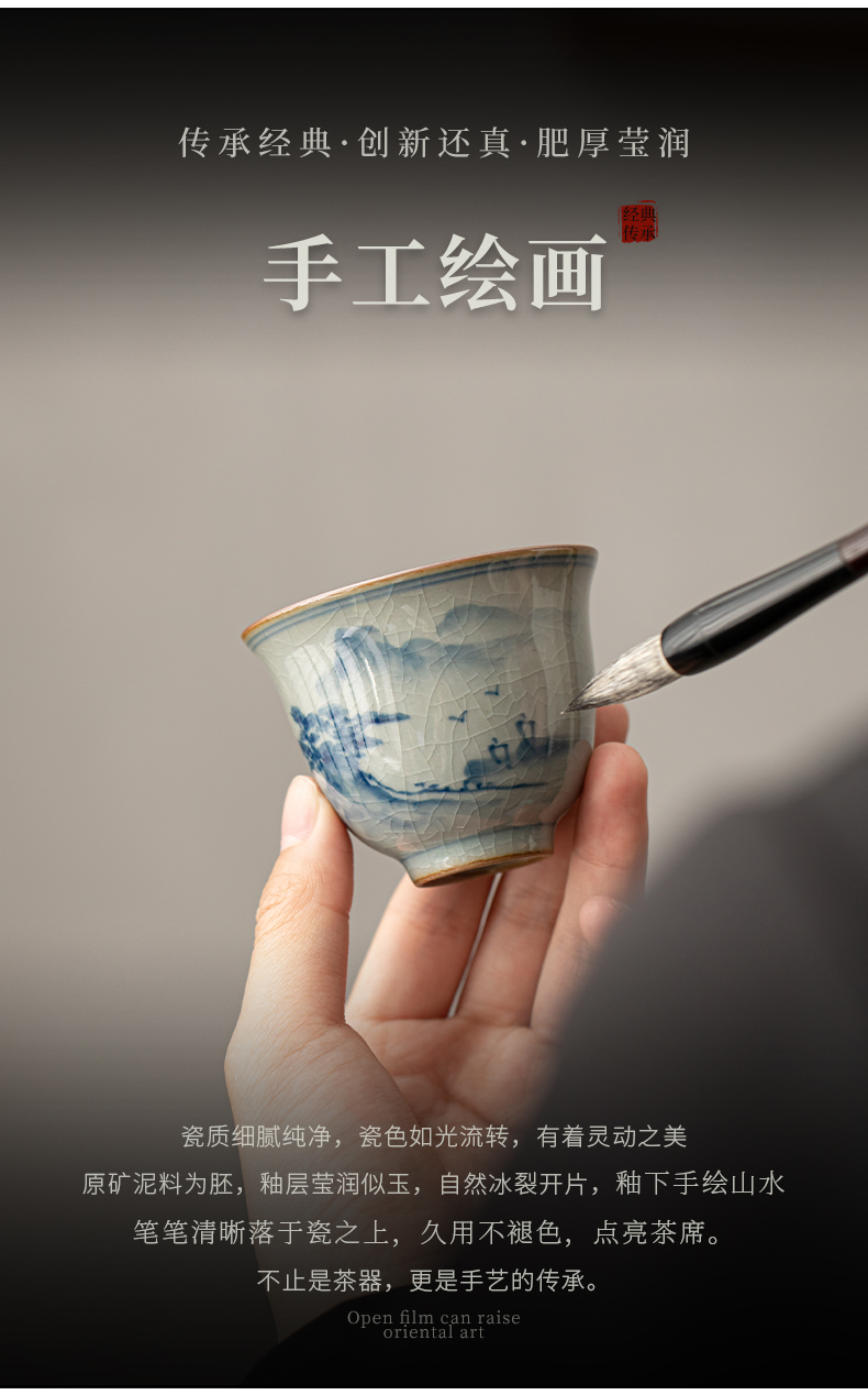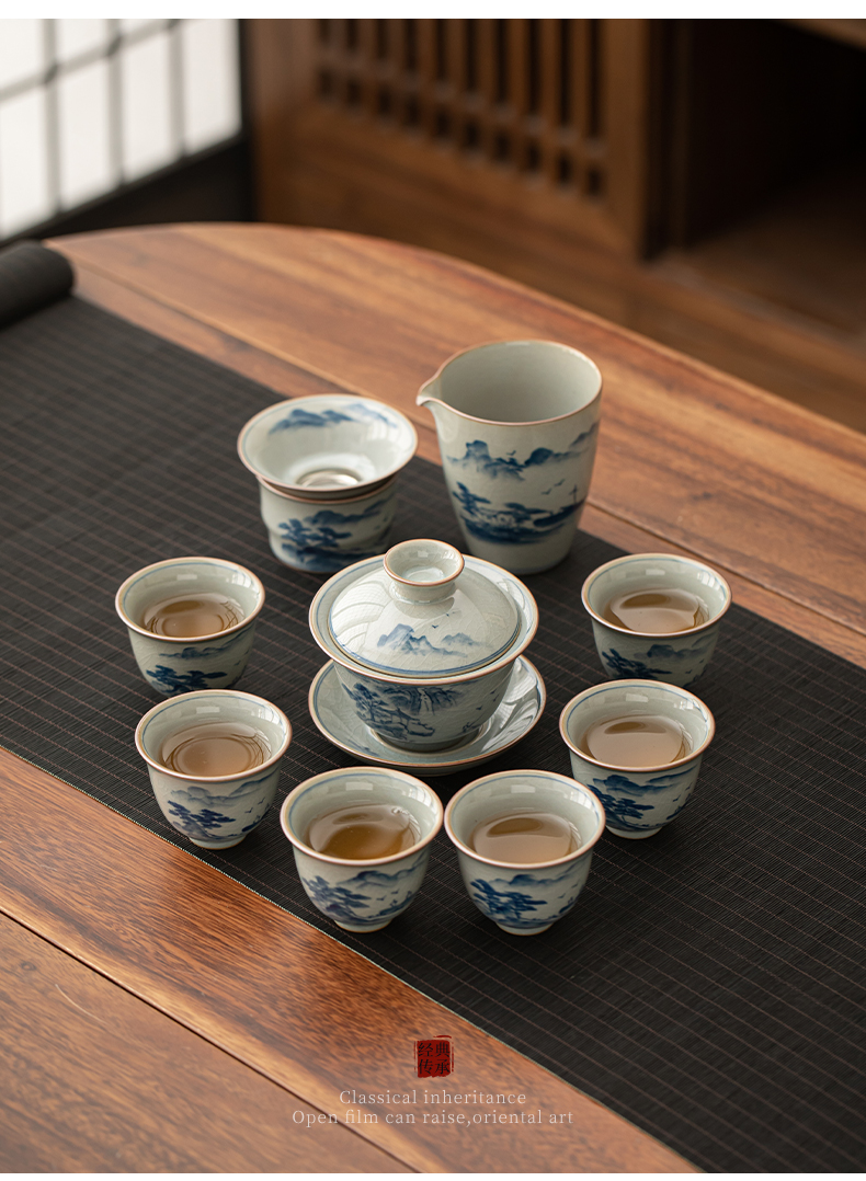 苏氏陶瓷(SUSHI CERAMICS)J1028汝窑手绘山水泛舟盖碗茶具套装苏爱珍作品(单位:套) 灰色