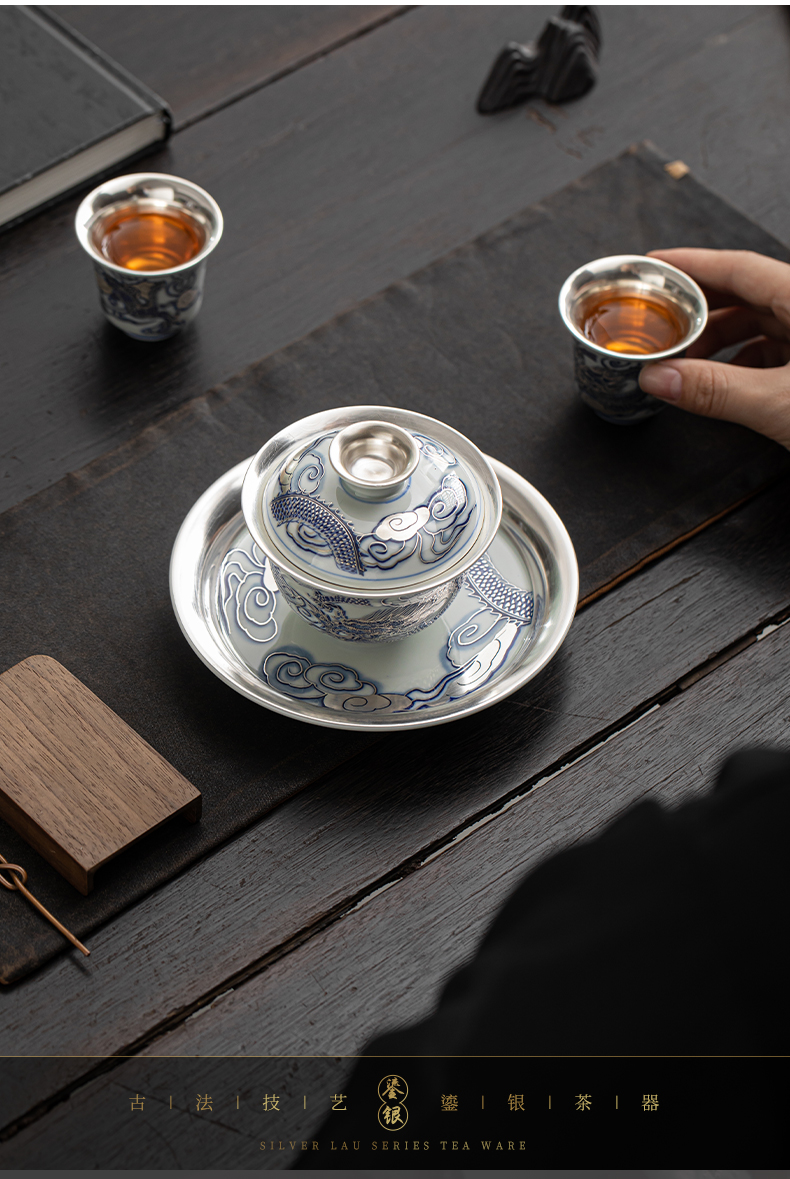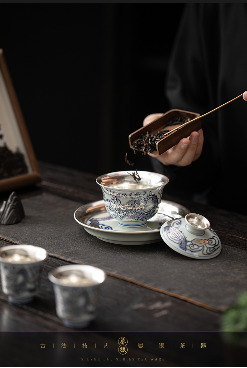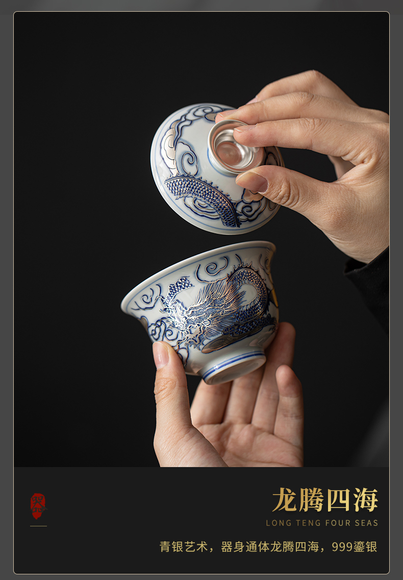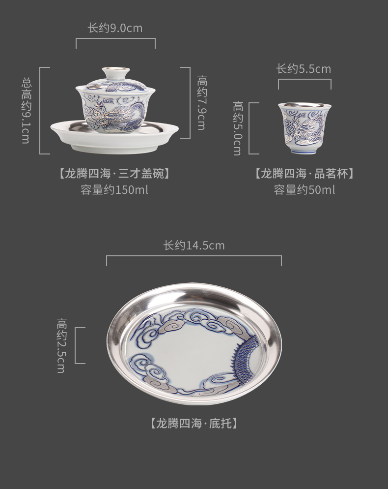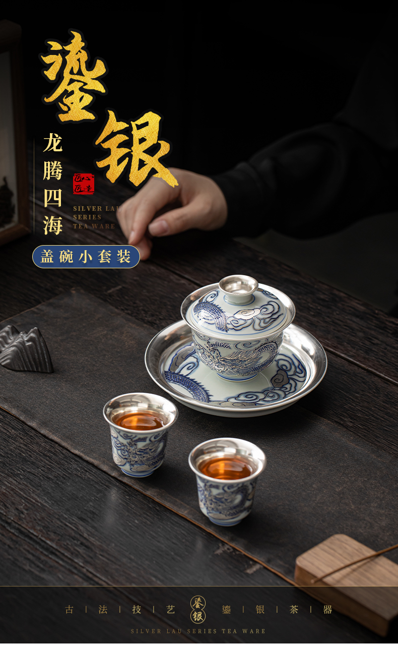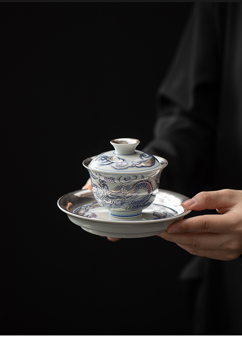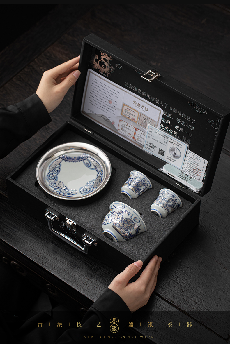 苏氏陶瓷(SUSHI CERAMICS)J1041鎏银龙腾四海一碗两杯套装非遗大师郑文强作品(单位: 银色
