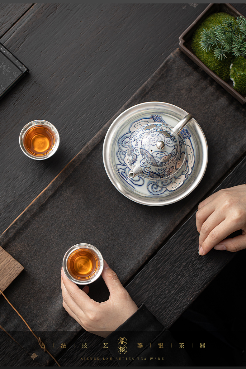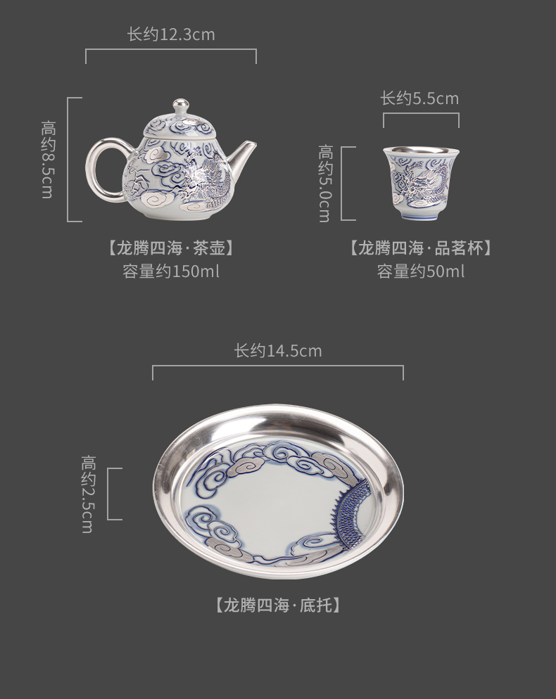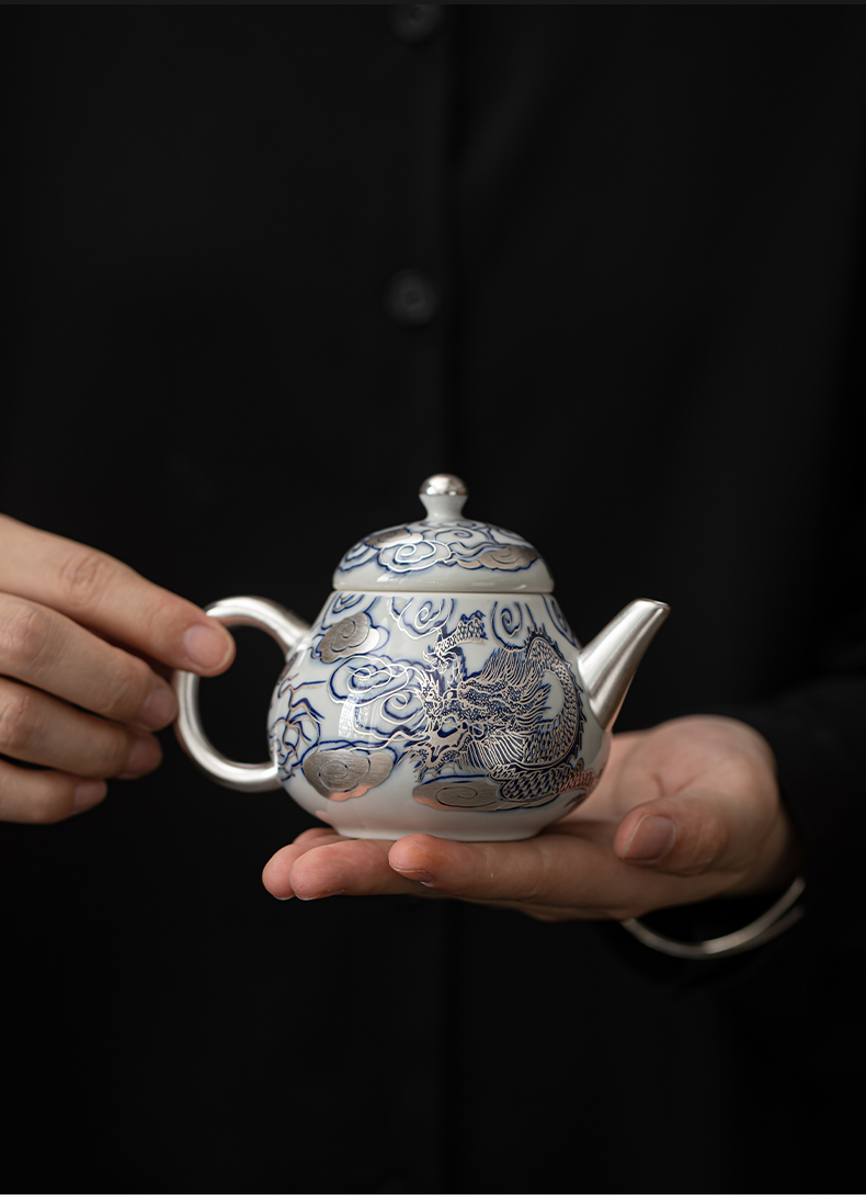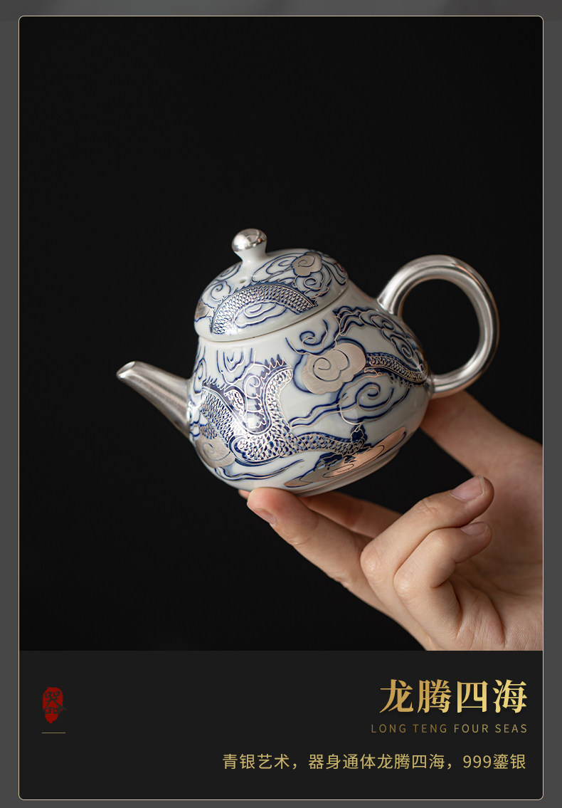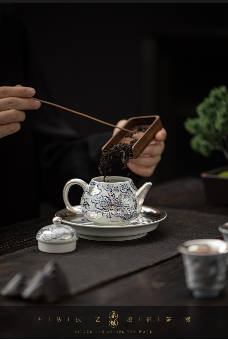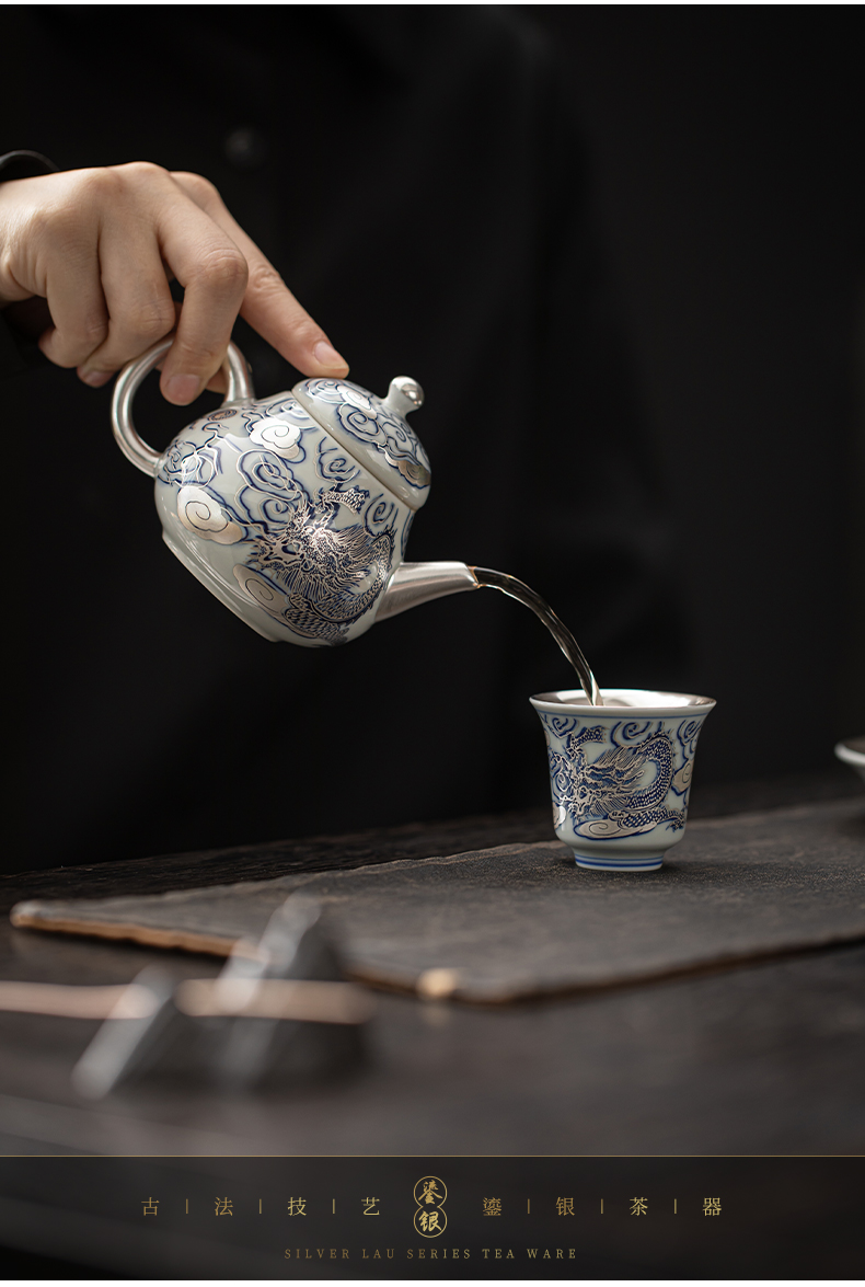 苏氏陶瓷(SUSHI CERAMICS)J1040鎏银龙腾四海一壶两杯套装非遗大师郑文强作品(单位: 银色