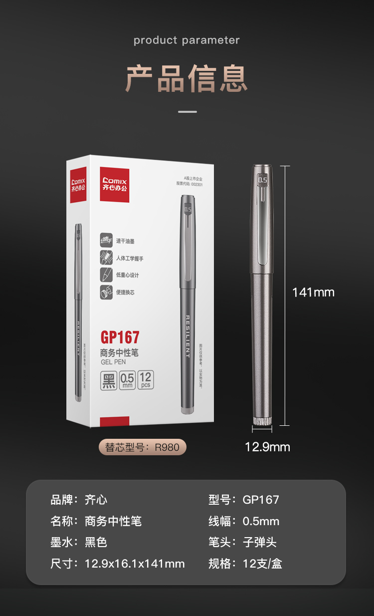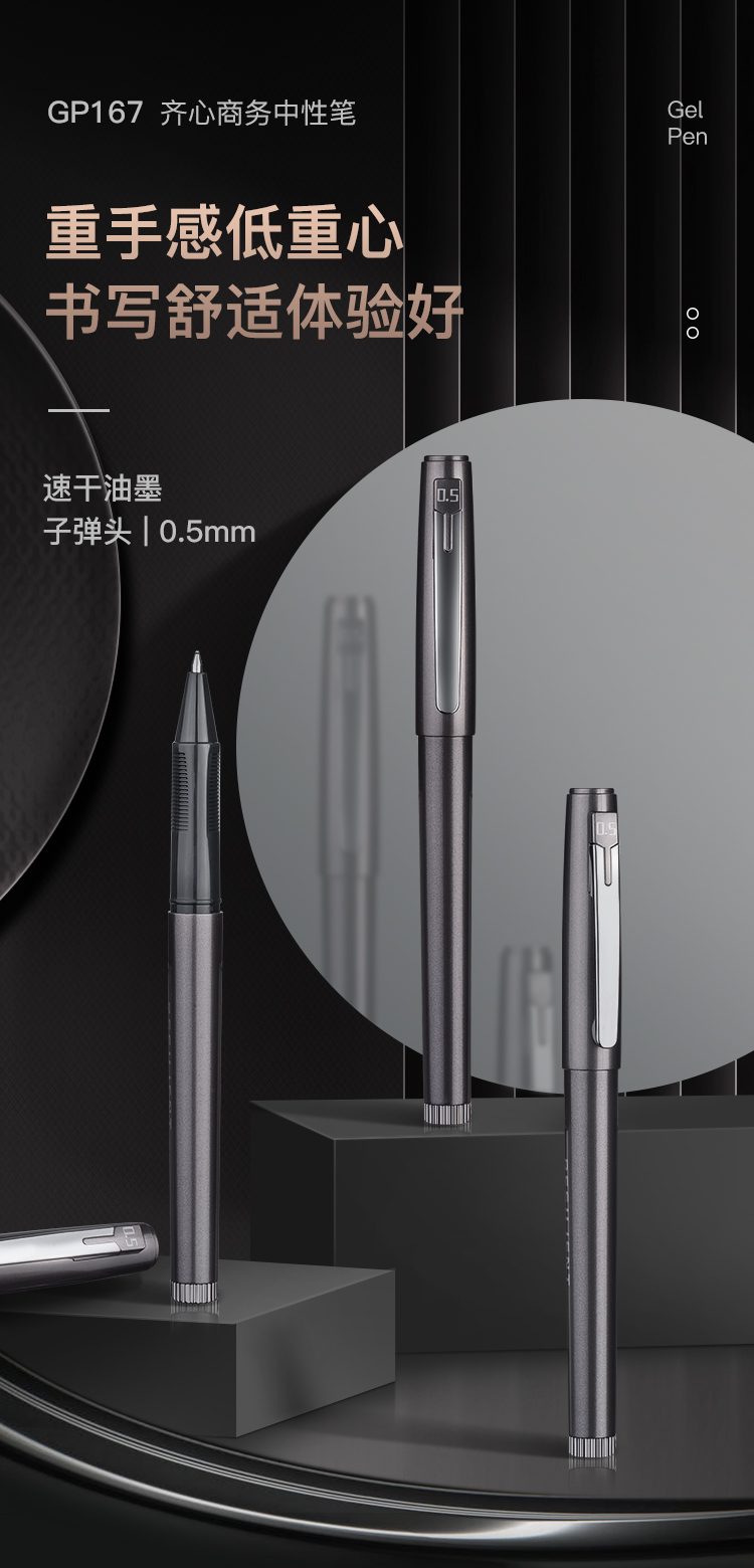 齐心 GP167 低重心商务中性笔 速干 子弹头 0.5mm 12支/盒 黑色