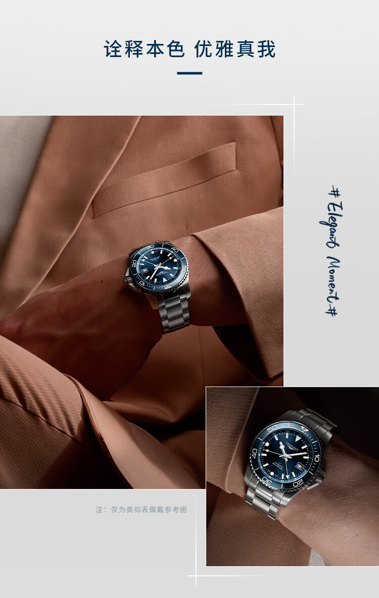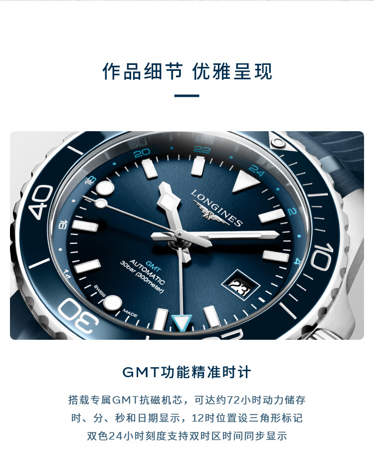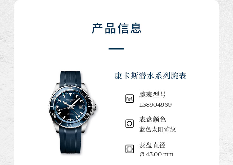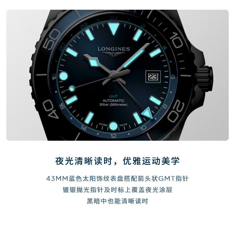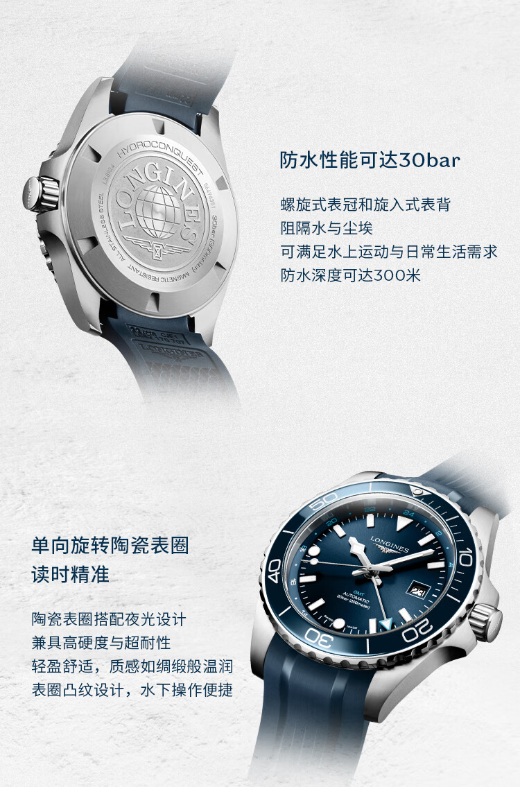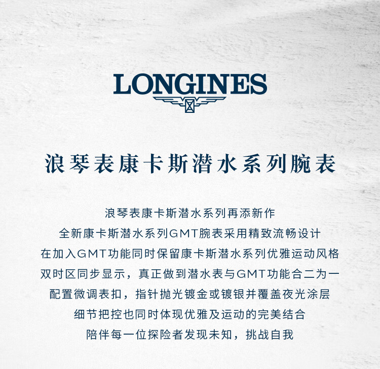 浪琴Longines 康卡斯潜水系列GMT机械手表男表 L3.890.4.96.9(单位1块) 蓝色