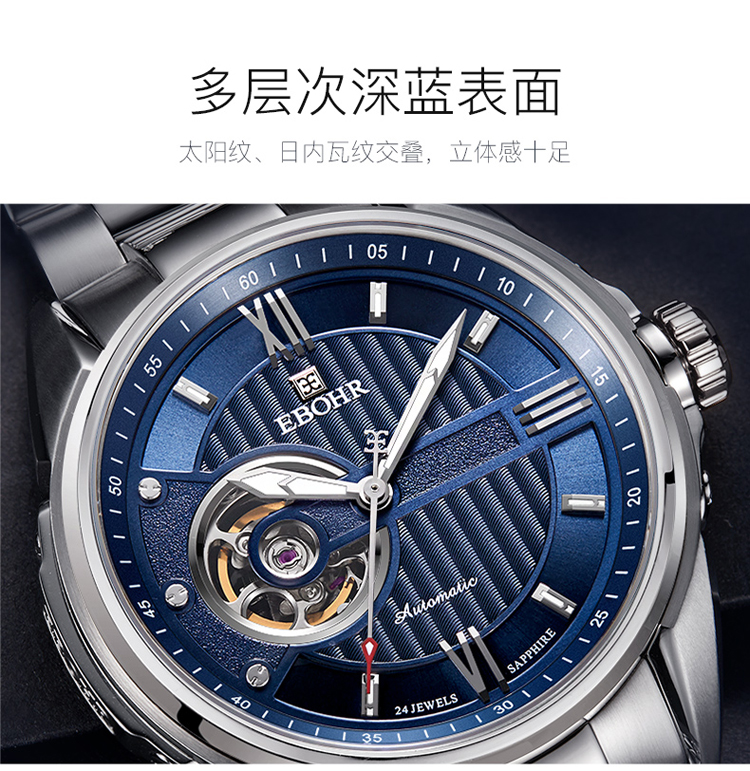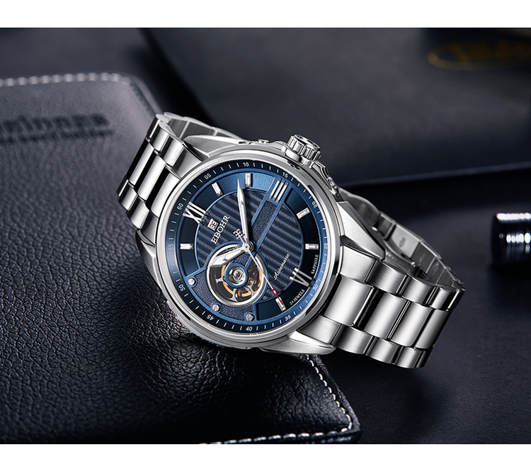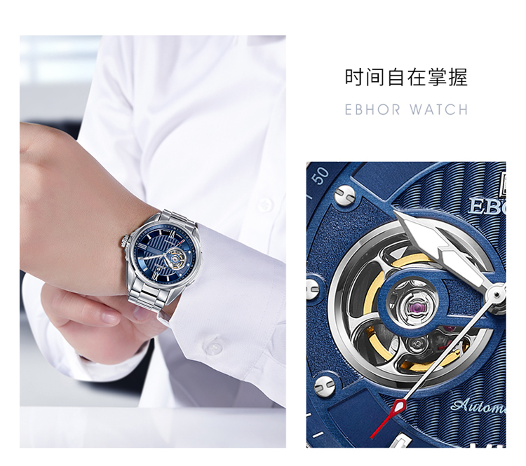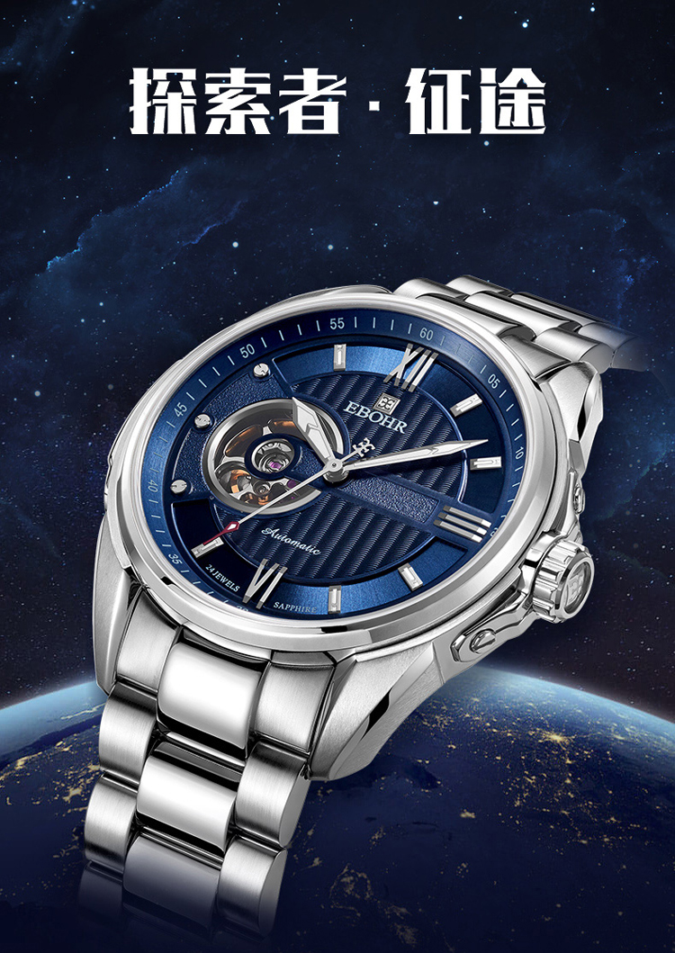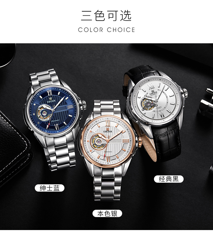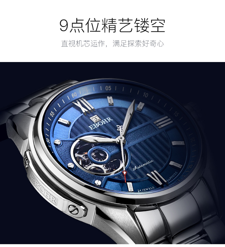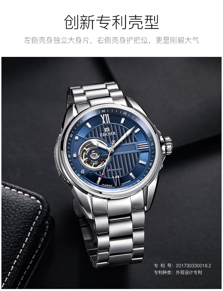 依波(EBOHR) 探索者系列 自动机械手表镂空商务时尚玫金钢带男表17020211(单位1块) 白色