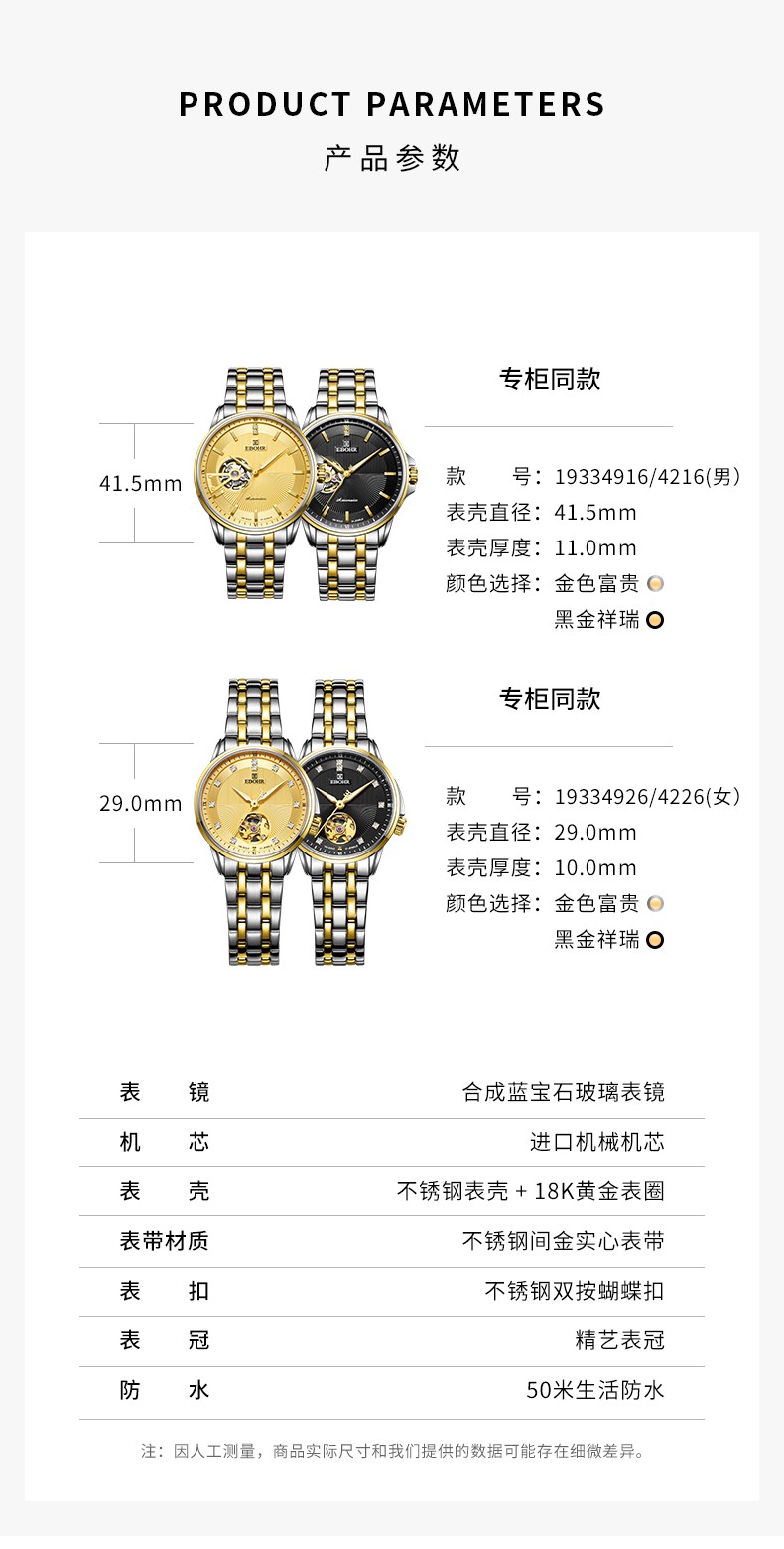依波(EBOHR) 大师经典 18K金机械手表黑金祥瑞情侣对表 黑盘女表19334226(单位1块) 黑色