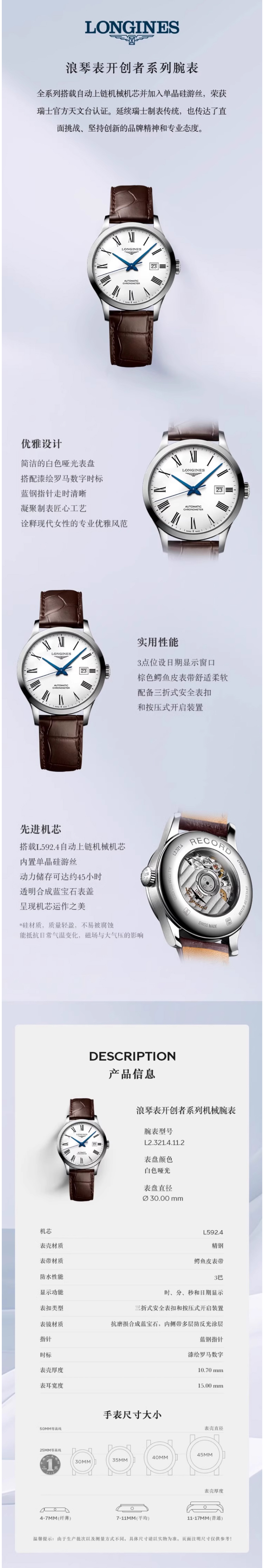 浪琴(LONGINES) 机械鳄鱼皮表带女表 L2.321.4.11.2 30.00 mm 白色(单位:块)