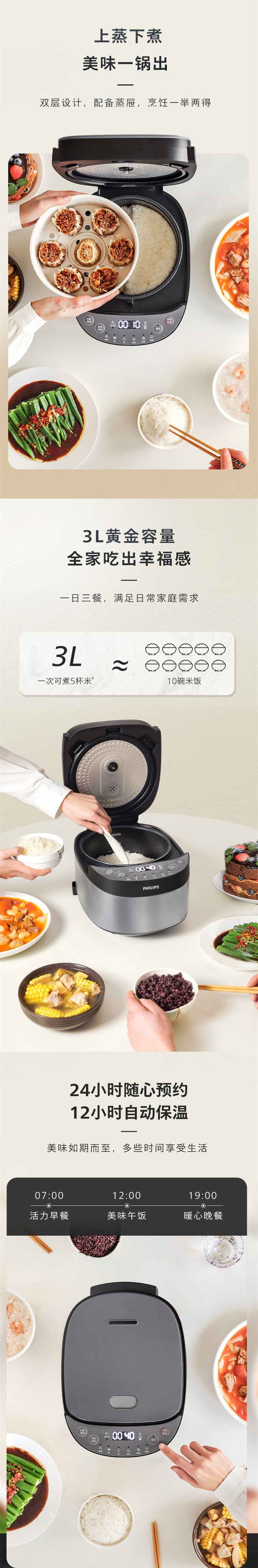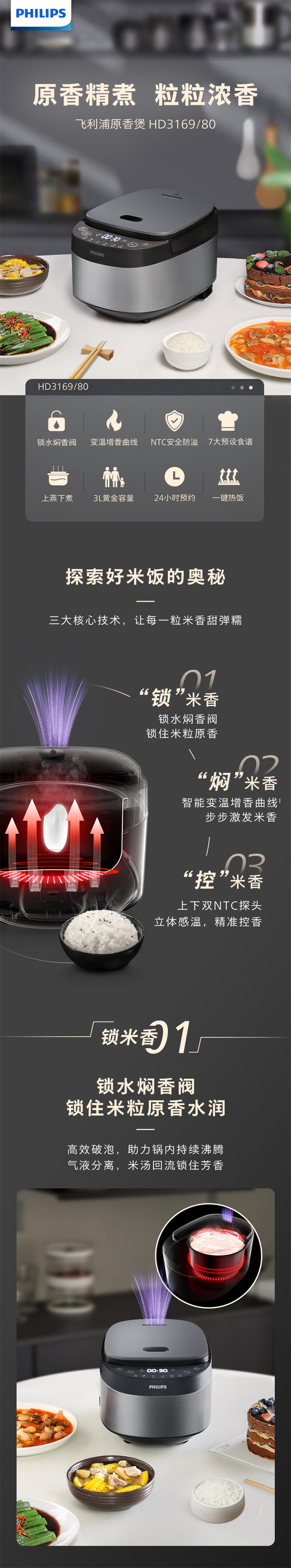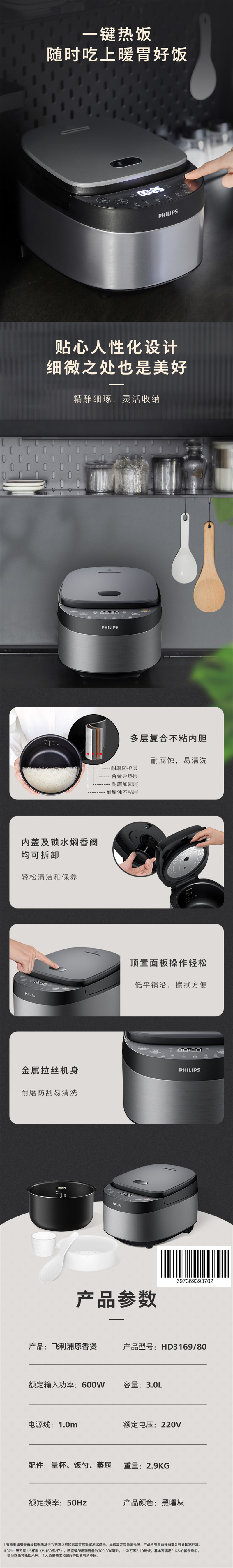 飞利浦(PHILIPS) 电饭煲原香电饭锅智能加热煲汤HD3169/80(单位:台) 银色