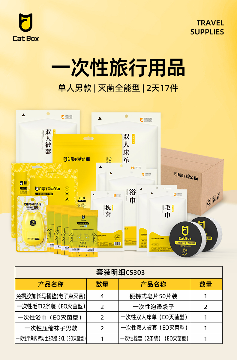 自带干粮的猫 一次性旅行用品 CS303 单人男款2天17件(灭菌全能型) 白色(单位:套)