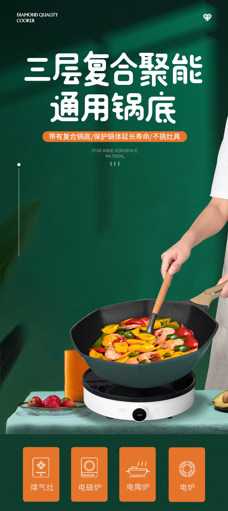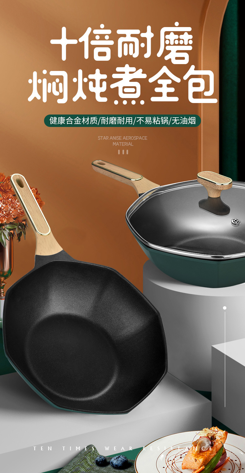 翰乐 八角不粘炒锅 SDD-009 33cm 墨绿色(单位:套)