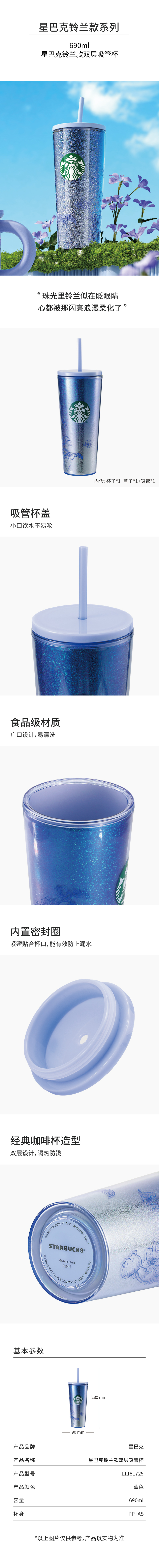 星巴克(Starbucks) 铃兰款双层吸管杯 11181725 690ml 蓝色(单位:个)