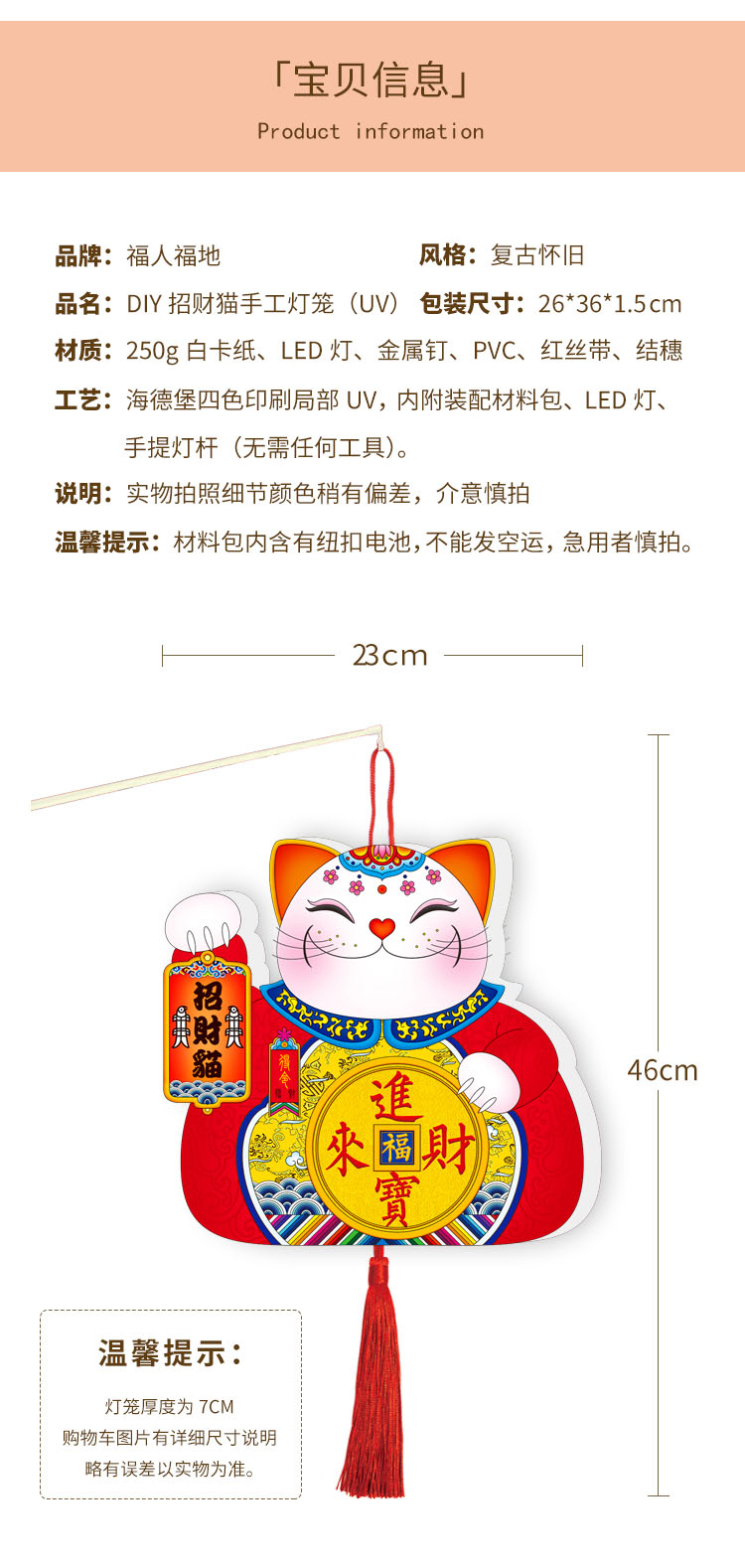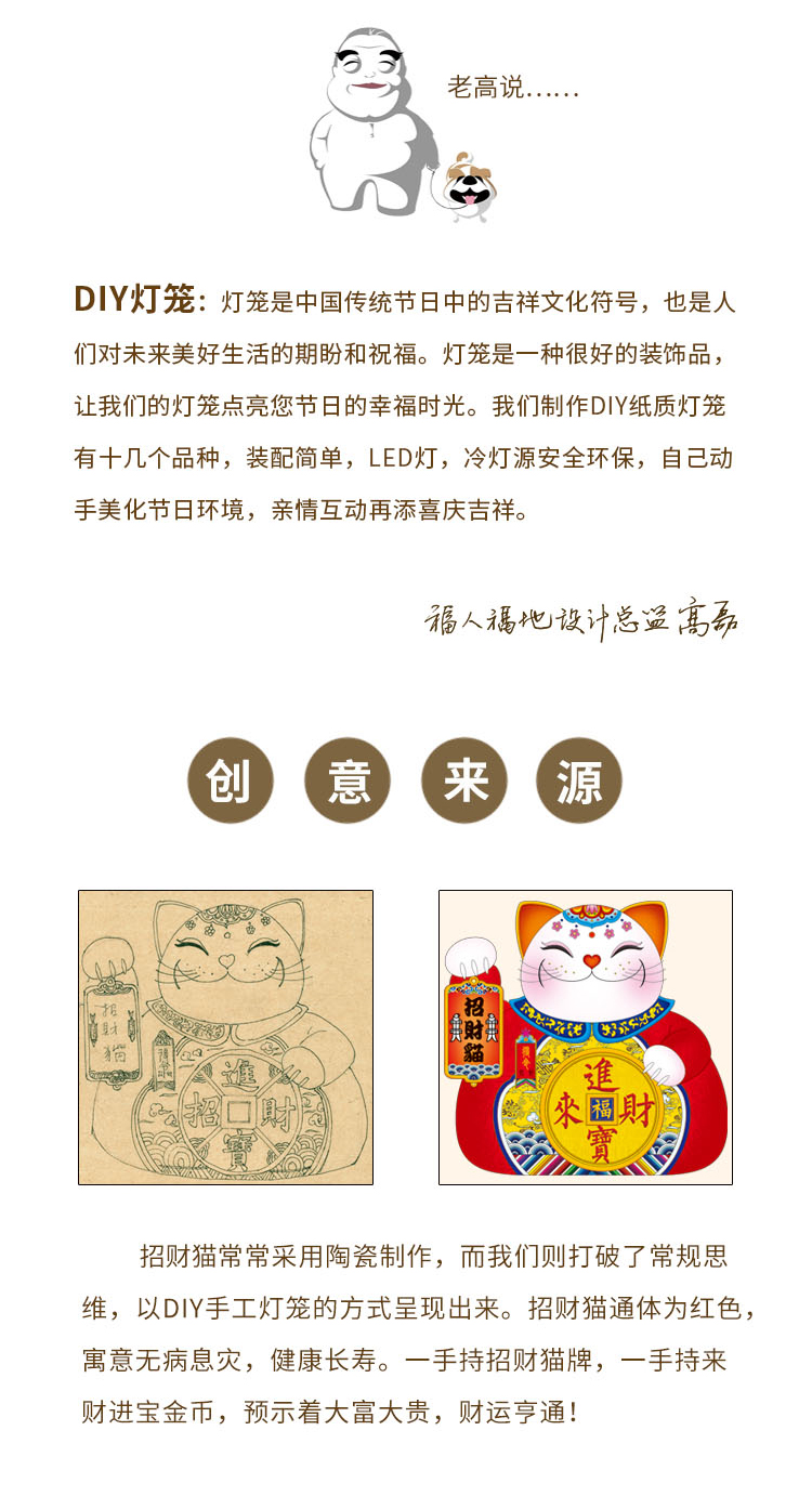 福人福地(FURENFUDI) 幼儿园diy手工创意文创灯笼 DB.23.01.02.01 23*46cm 招财猫灯笼(单位:个)