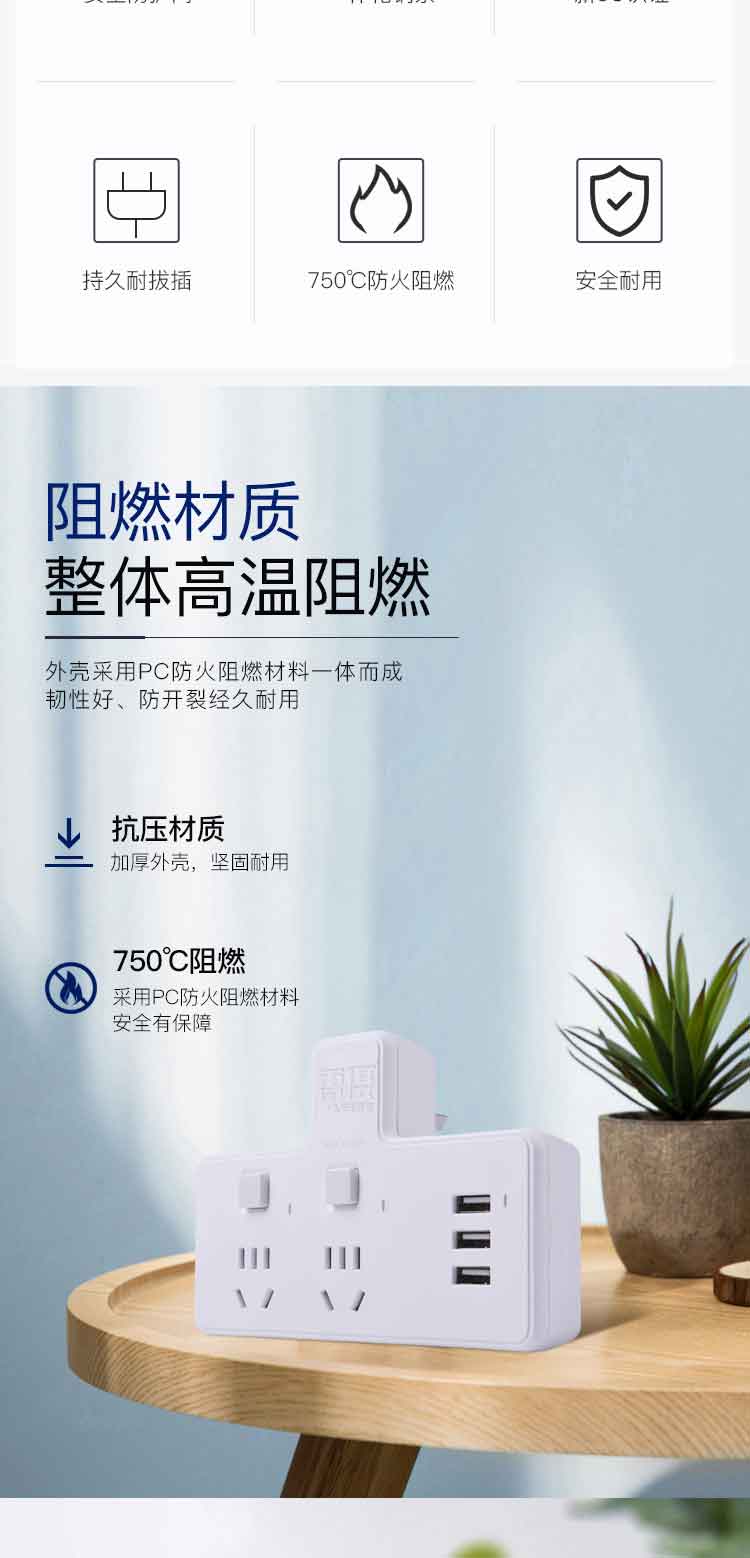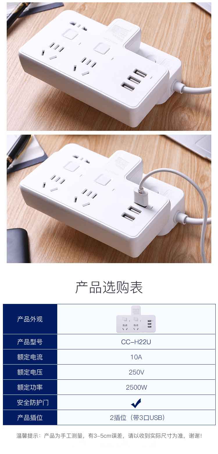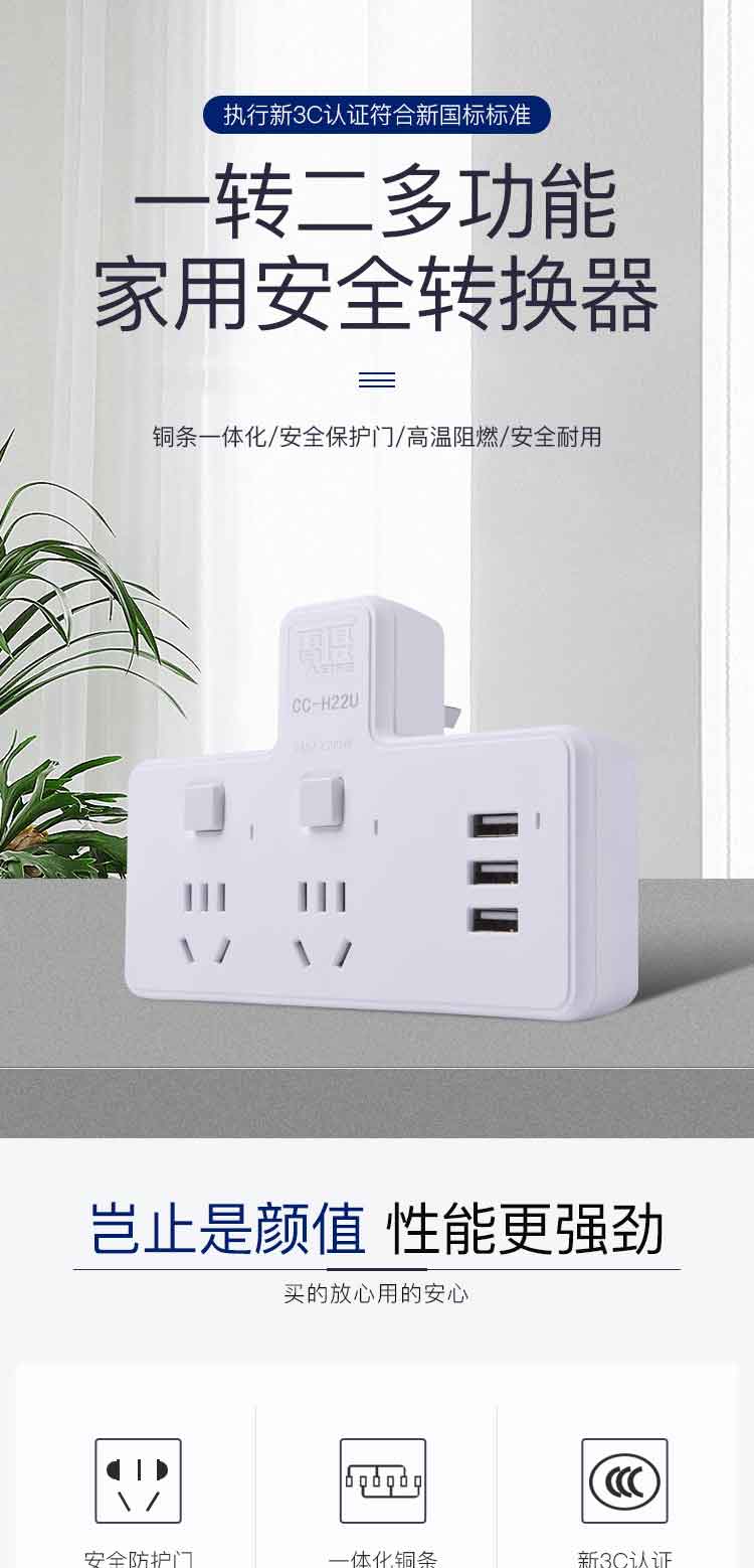 雷摄LEISE 一转二USB插座分控无线转换插座/转换插头/电源转换器 3口USB+2位CC-H22U 件 白色