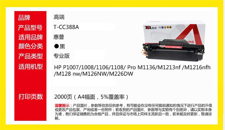 高端硒鼓T-CC388A适用HP P1007/1008/1106/1108/Pro M1136 支 黑色