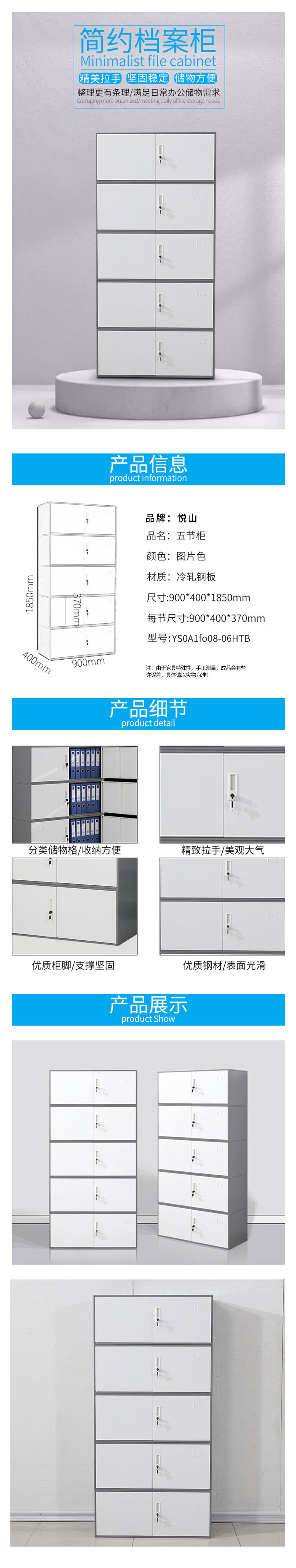 悦山 分体五节文件柜档案柜办公室柜 900*400*1850*1台 灰+白
