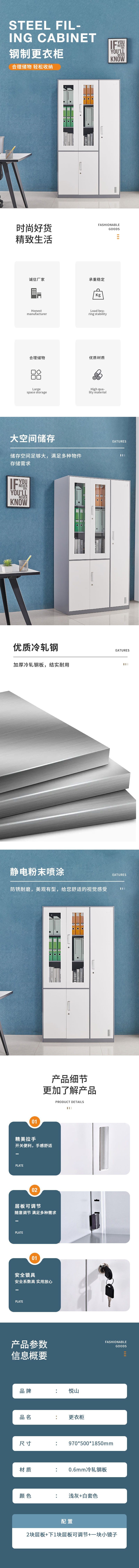 悦山文件柜 五门柜970*500*1850mm*1台 浅灰+白