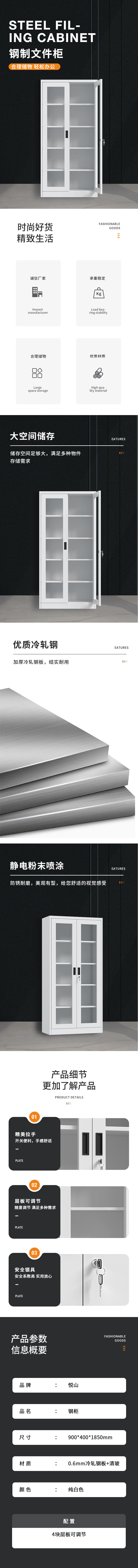 悦山纯白文件柜 通玻5层凭证柜900*400*1850*1台 纯白