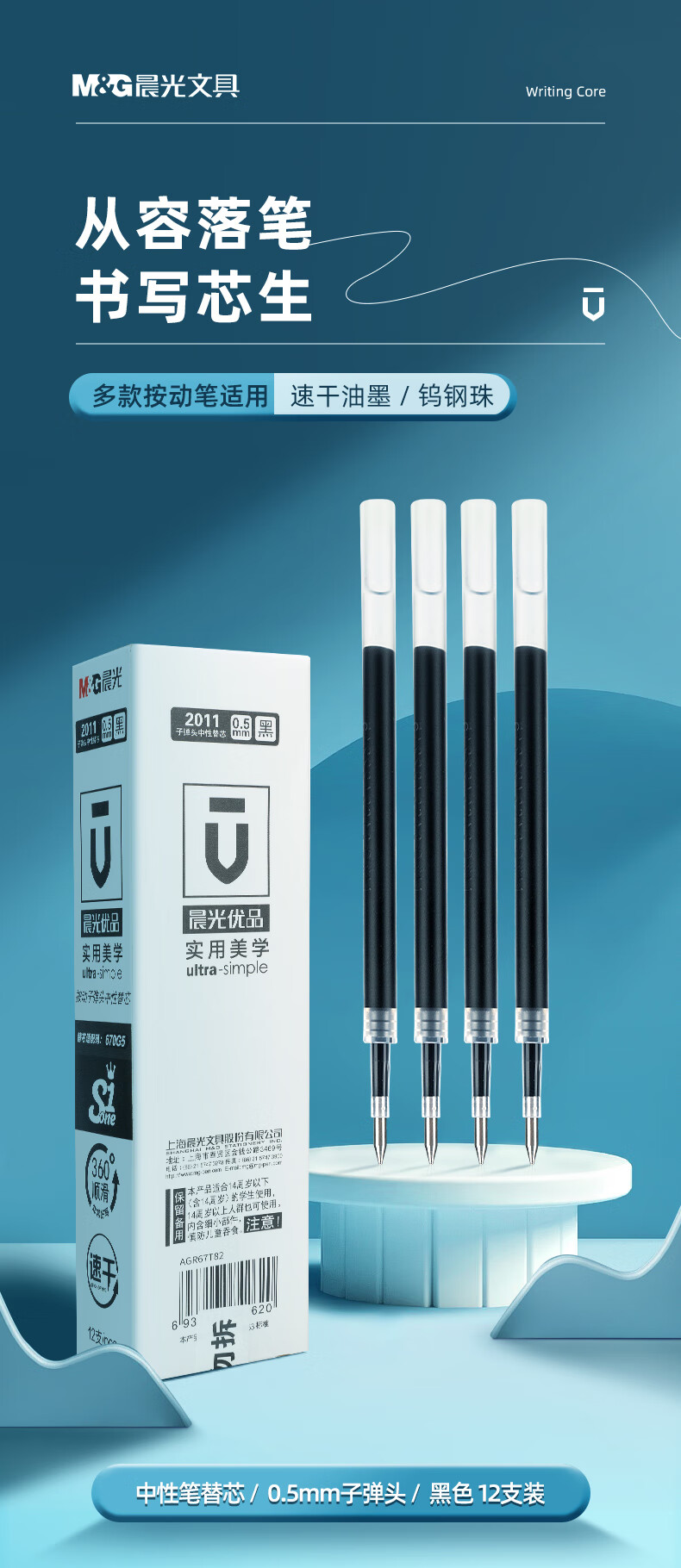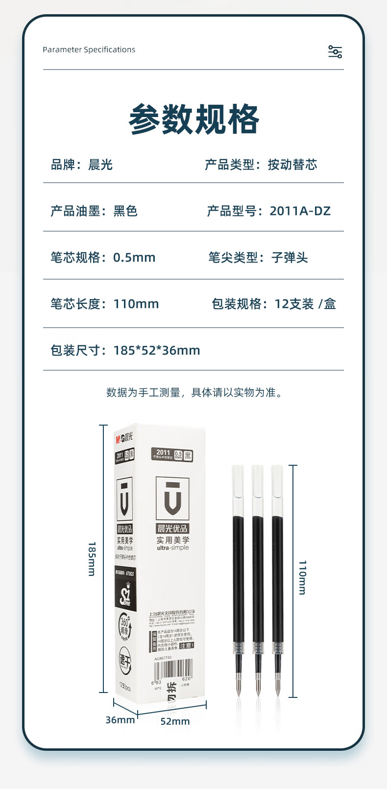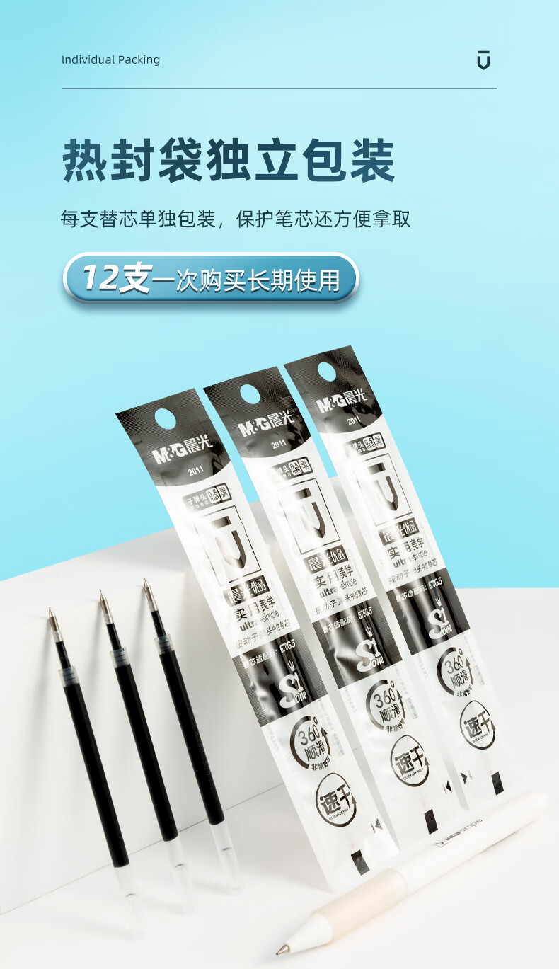 晨光(M&G) 2011 0.5mm,12支装 按动子弹头签字笔替芯 黑色(单位:盒)