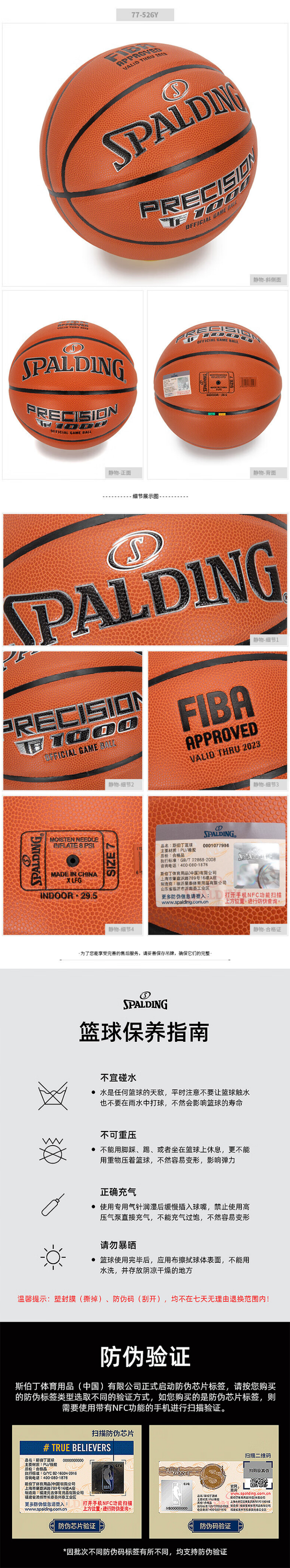 斯伯丁(SPALDING)篮球7号篮球TF1000传奇FIBA比赛专用室内外成人青少年通用77-52 棕色