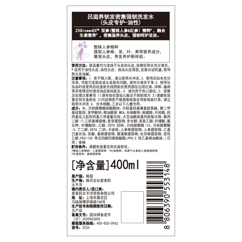 吕滋养韧发密集强韧(头皮专护-油性)特惠装400ml(单位:瓶) 紫色