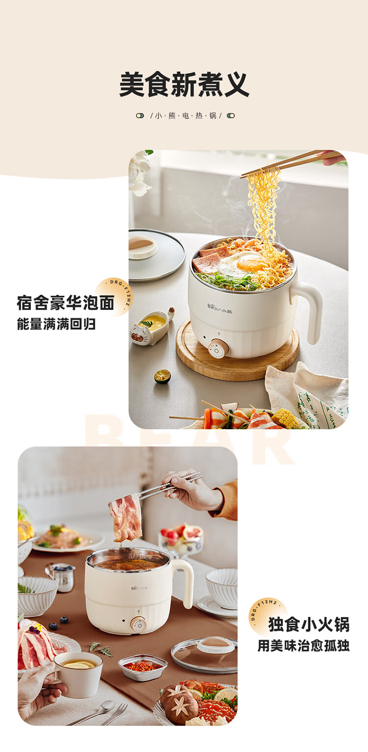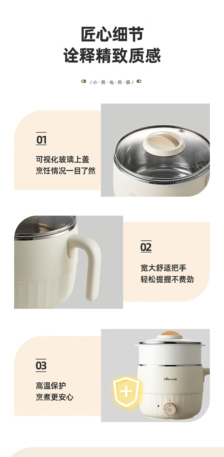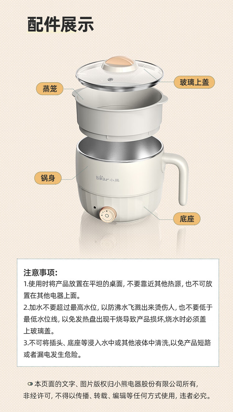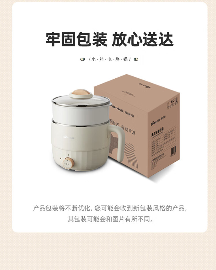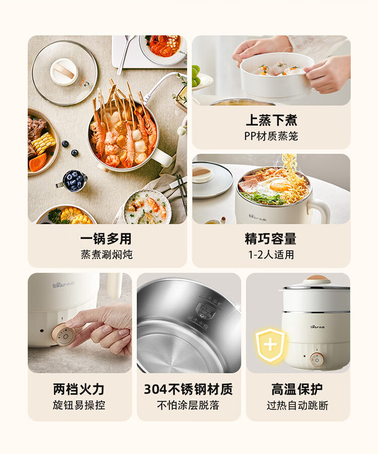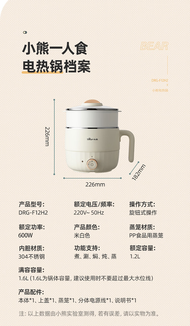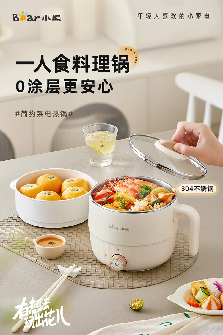 小熊(Bear)电煮锅1.6L多用途锅DRG-F12H2 配蒸笼/台 米黄色