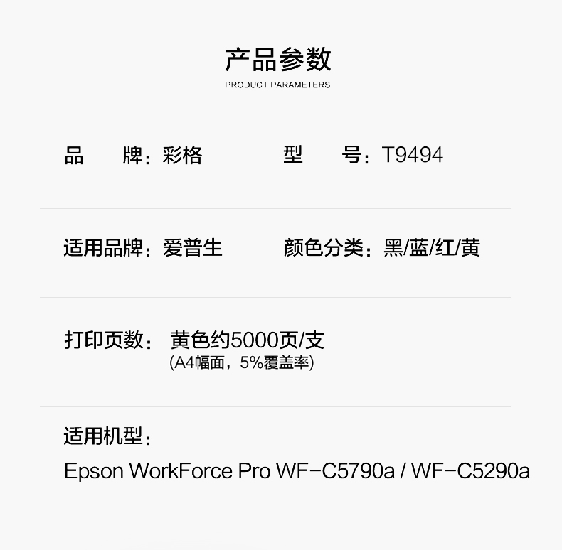 彩格T9494墨盒墨袋 适用Epson WorkForce Pr WF-C5790a(单位:支) 黄色
