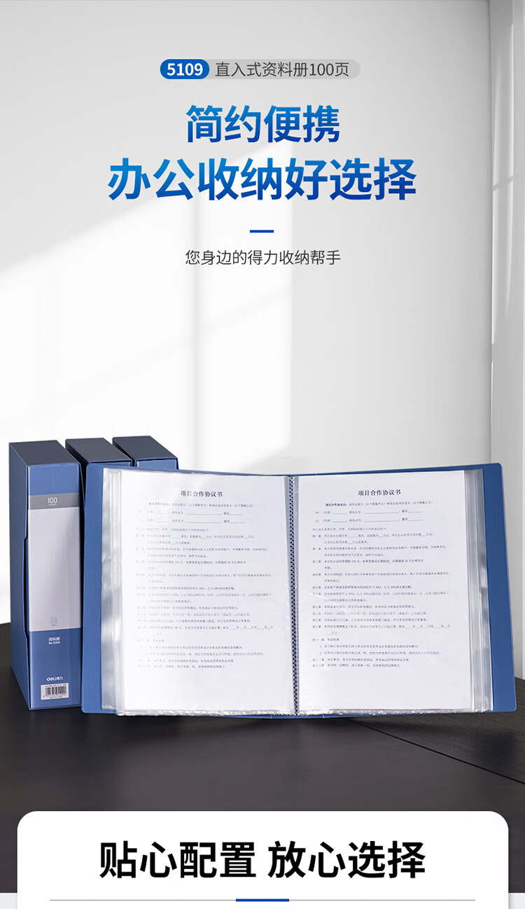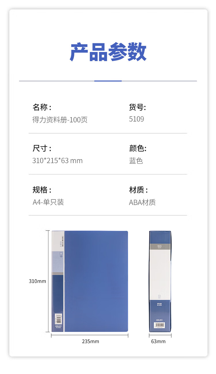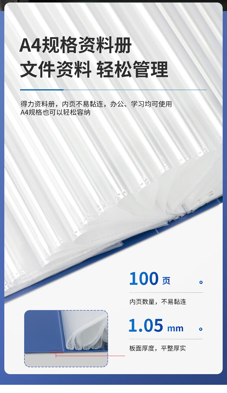 得力(deli)A4/100页大容量学生资料册文件活页收纳册档案文件夹5109 单位:个 蓝色