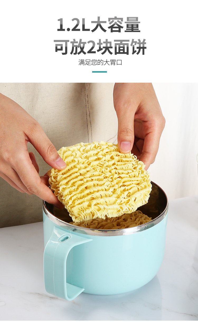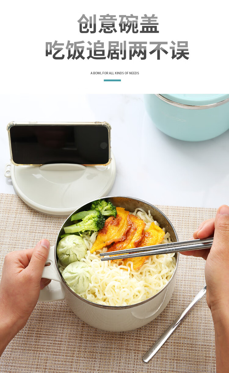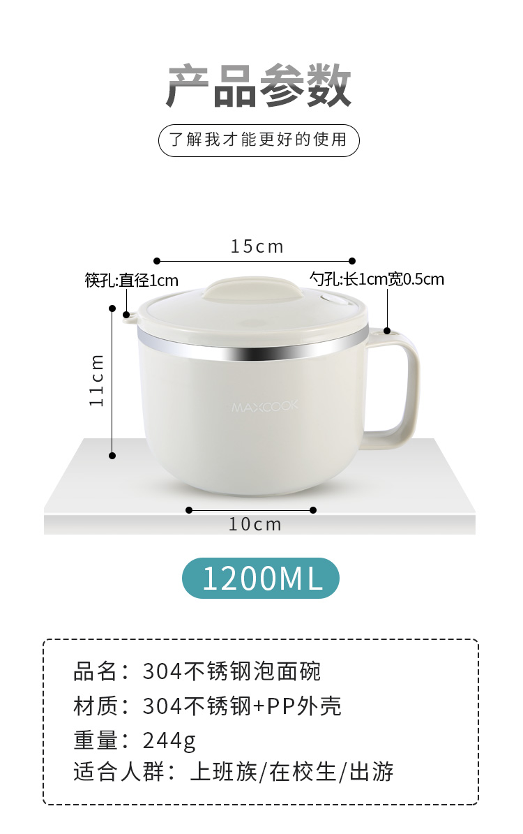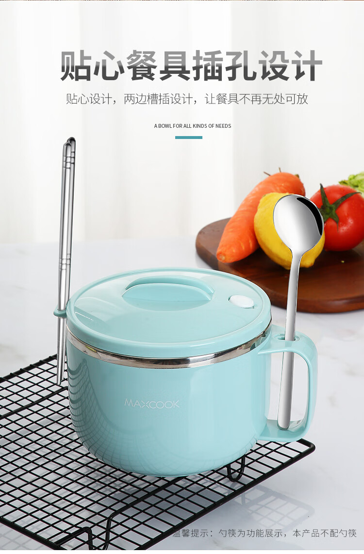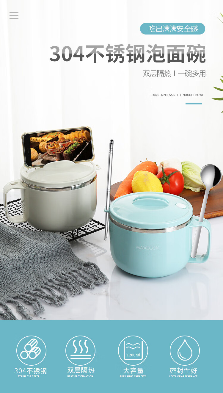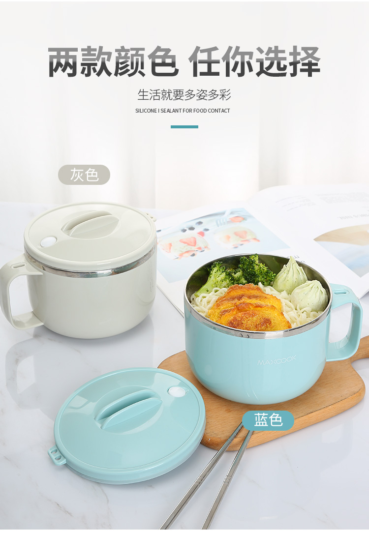 美厨304不锈钢泡面碗 学生饭盒餐杯泡面杯1200ML 带盖 灰色MCWA108 单位:个