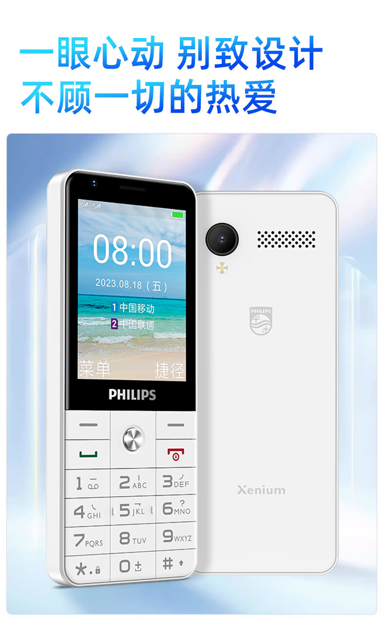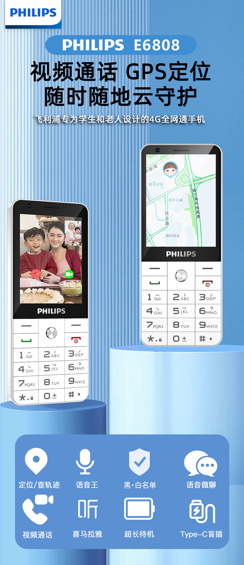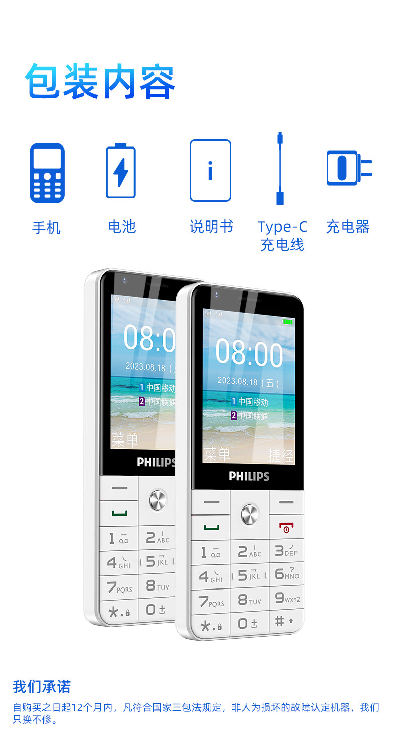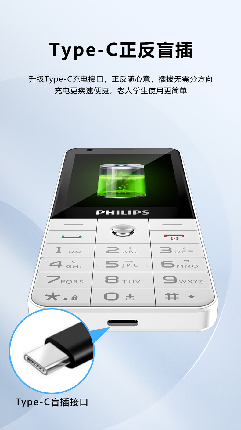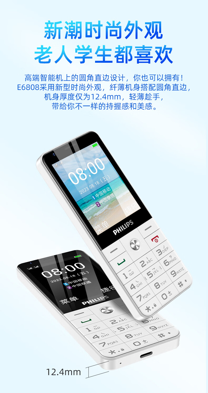 飞利浦E6808 星空黑 4G全网通老人手机 超长待机双卡双待老年机 大屏大字大声单位:台 白色