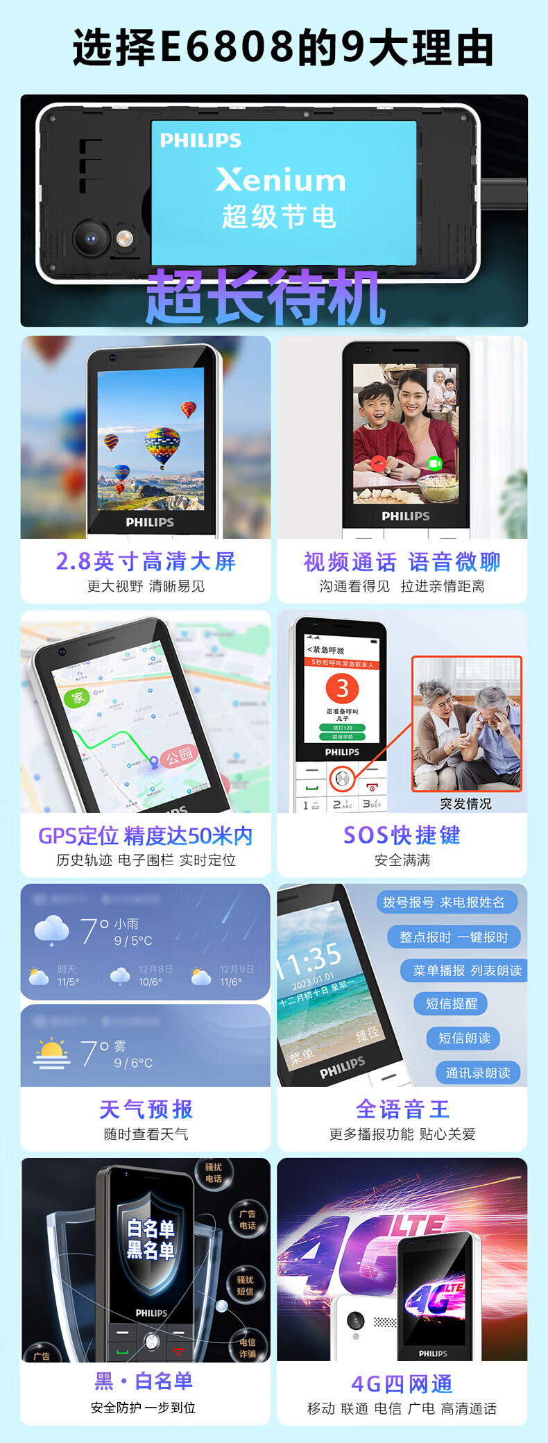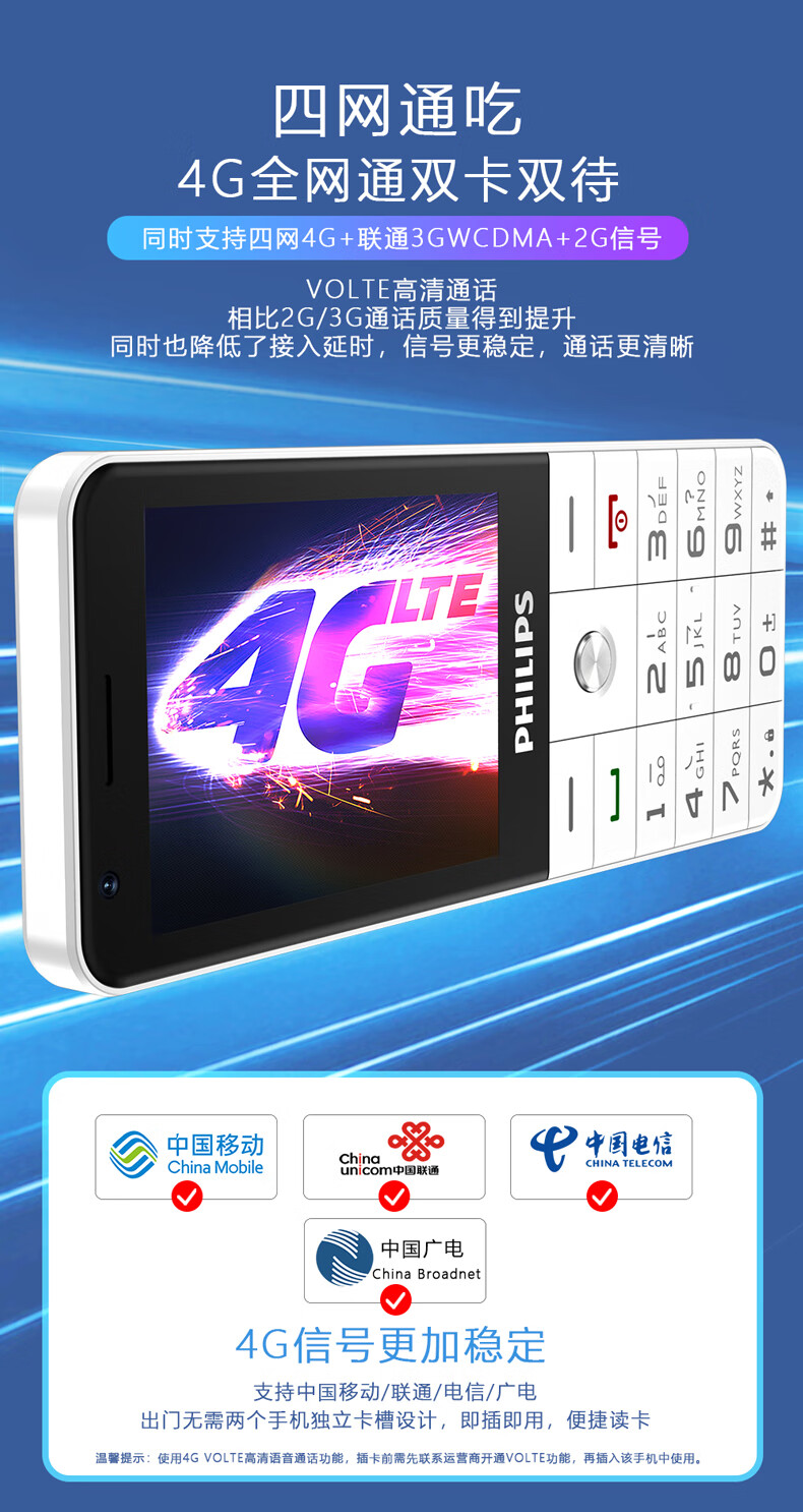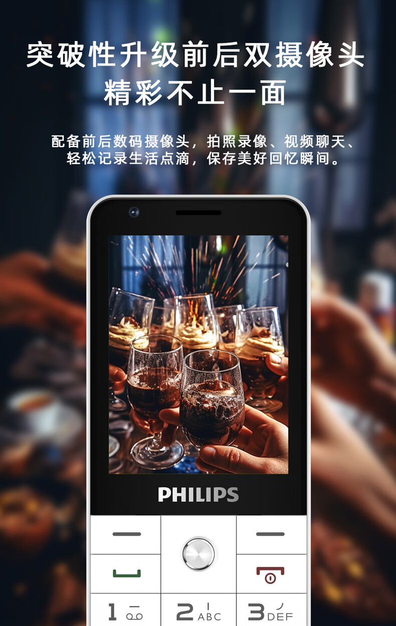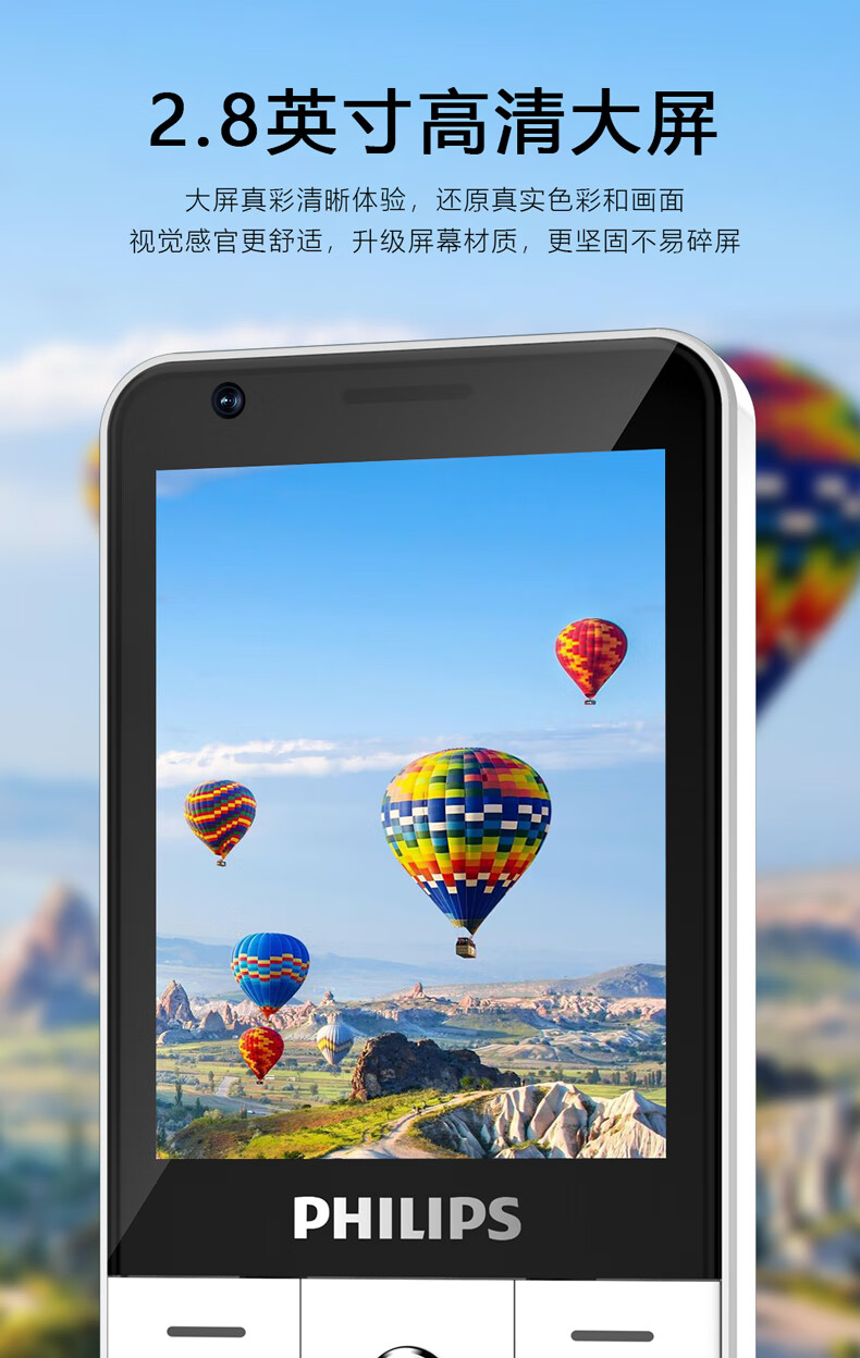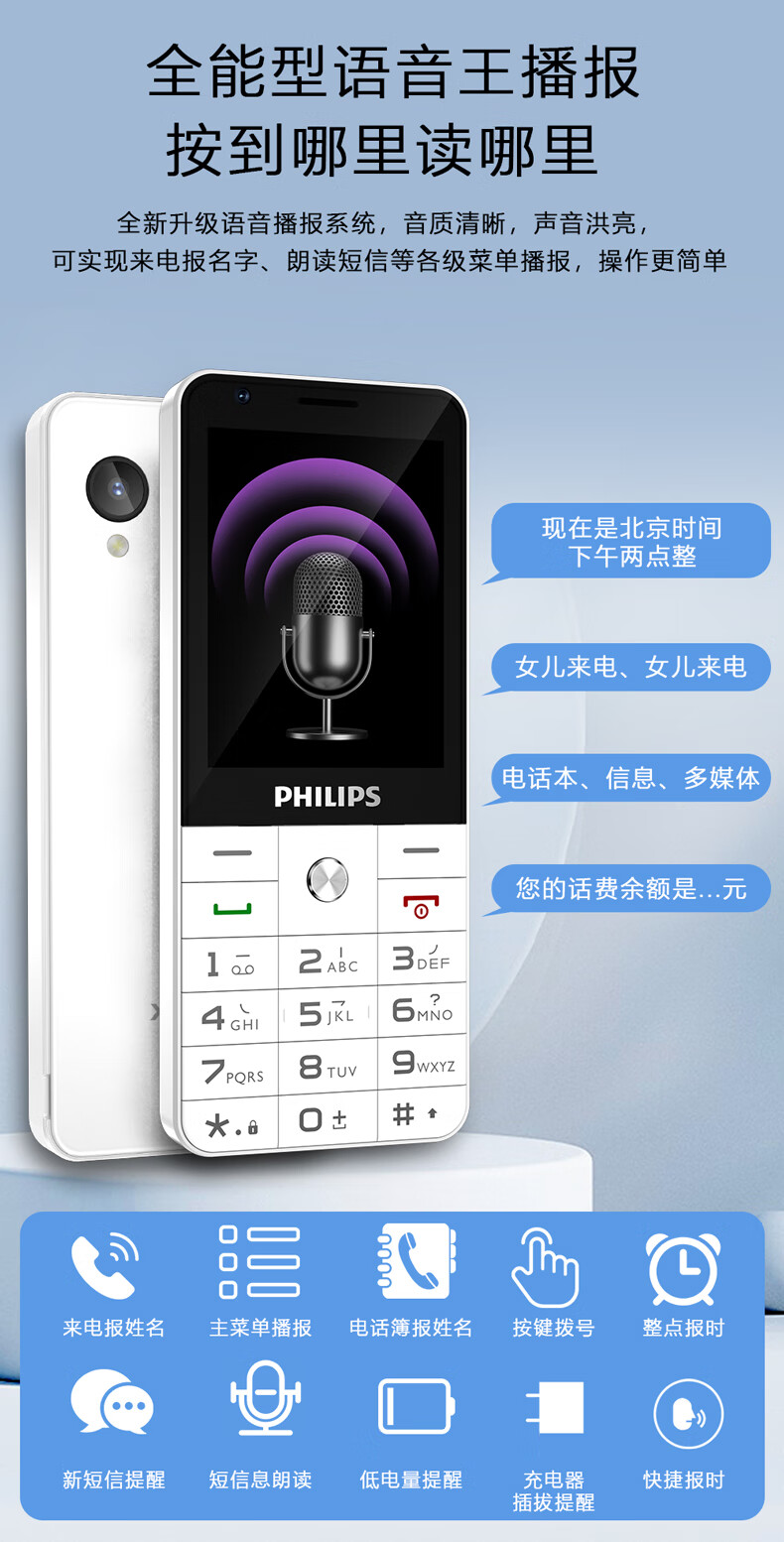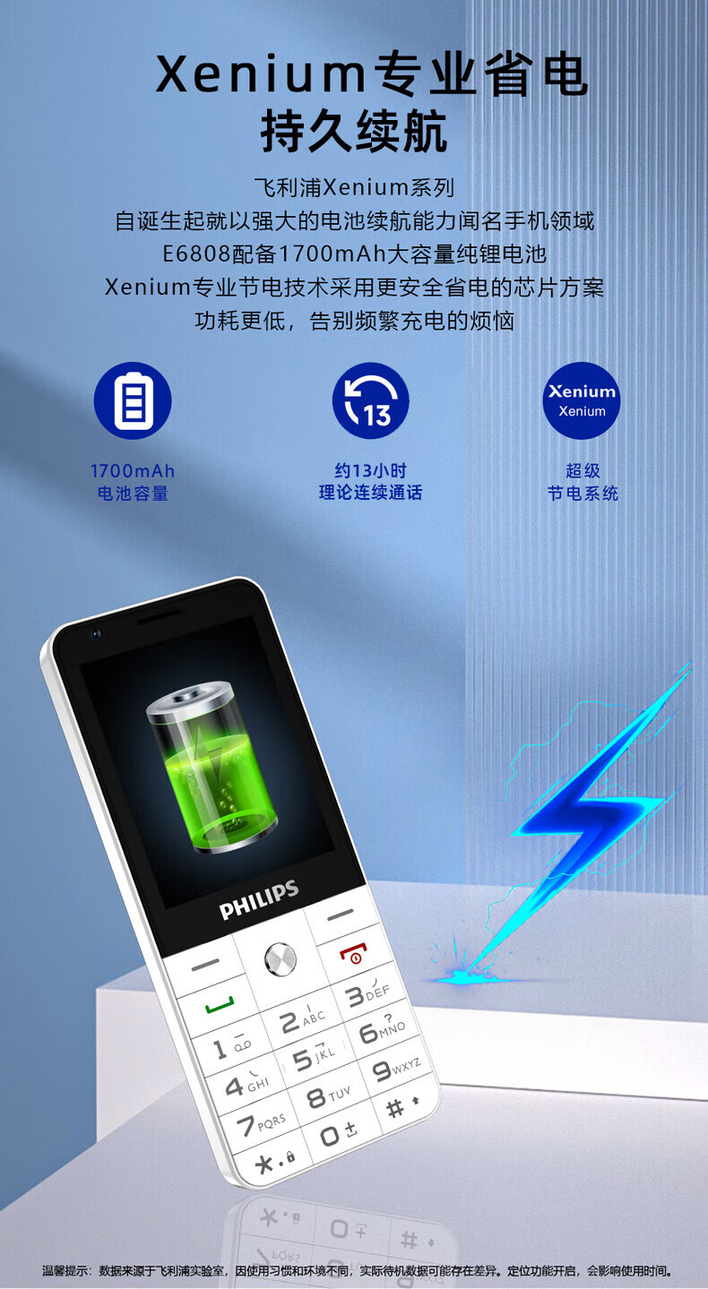 飞利浦E6808 星空黑 4G全网通老人手机 超长待机双卡双待老年机 大屏大字大声单位:台 白色